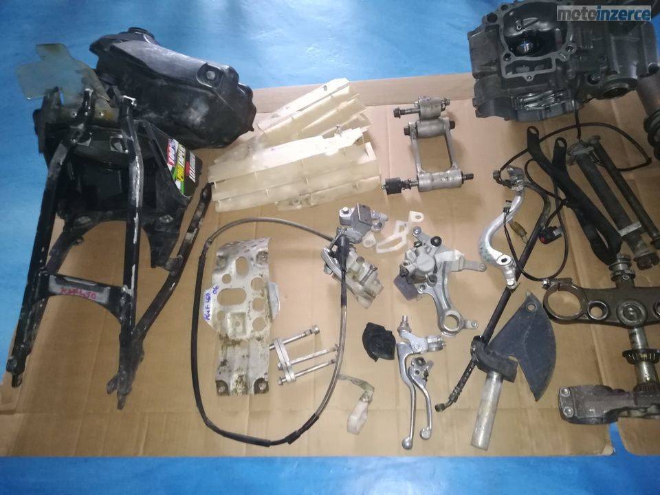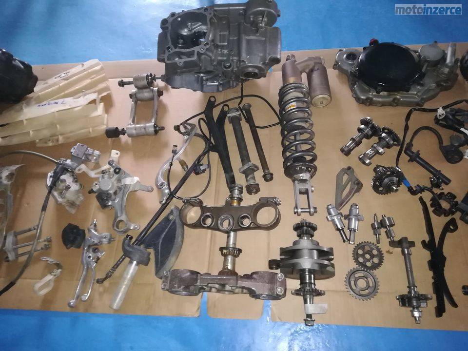 Ram, podsedlovka, sedlo, kyvna vidlice, stupacky, brzdy, bryle, centralni tlumic, osky kol, par plastu, airbox, motor 4 rychlostni prevodovka, klikova hridel, cdi, kabelaz, napinak rozvodu, vackova hridel, oska radici paky