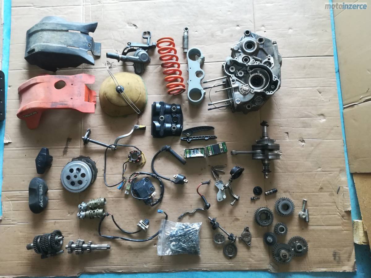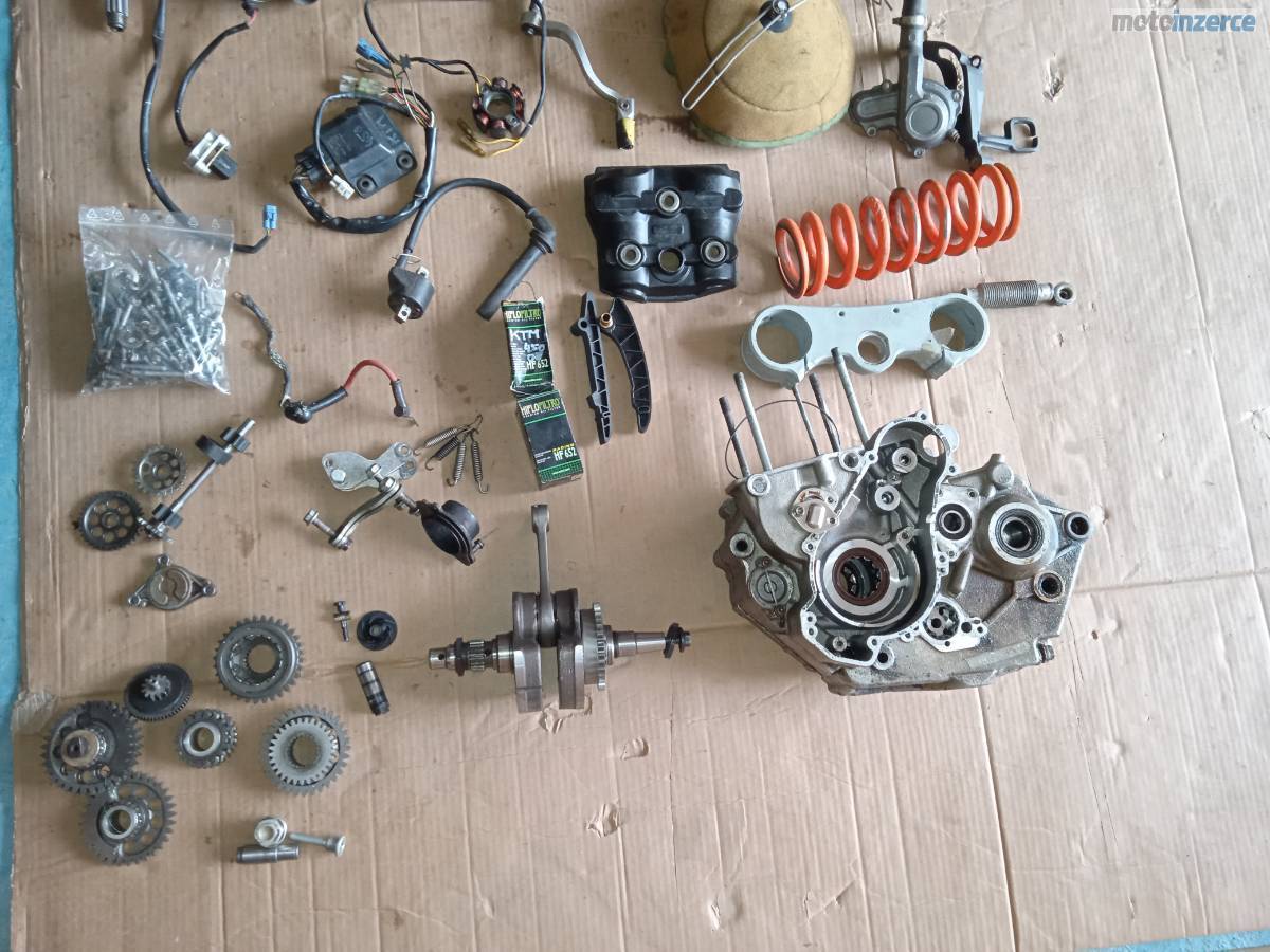 Kartery, klikova hridel, olejove cerpadlo, napinak rozvodu, cast prevodovky, zapalovani, CDI, fajka s induckou, odka radici paky radici paka, přitlačny talir spojky a lamely, olejove filtry, voditka rozvodoveho retezu, viko ventilu, viko vodni pumpy, pruzina centralniho tlumice, vrchni cast bryli,,brzdove kotouce, stupacky nove, lamaci packy nove, gripy