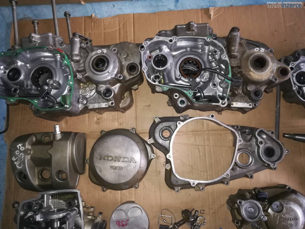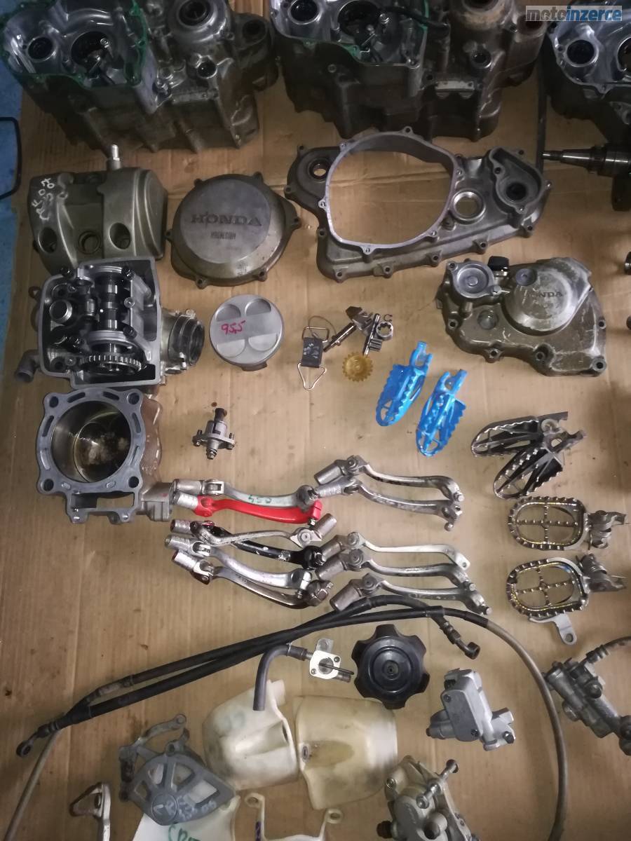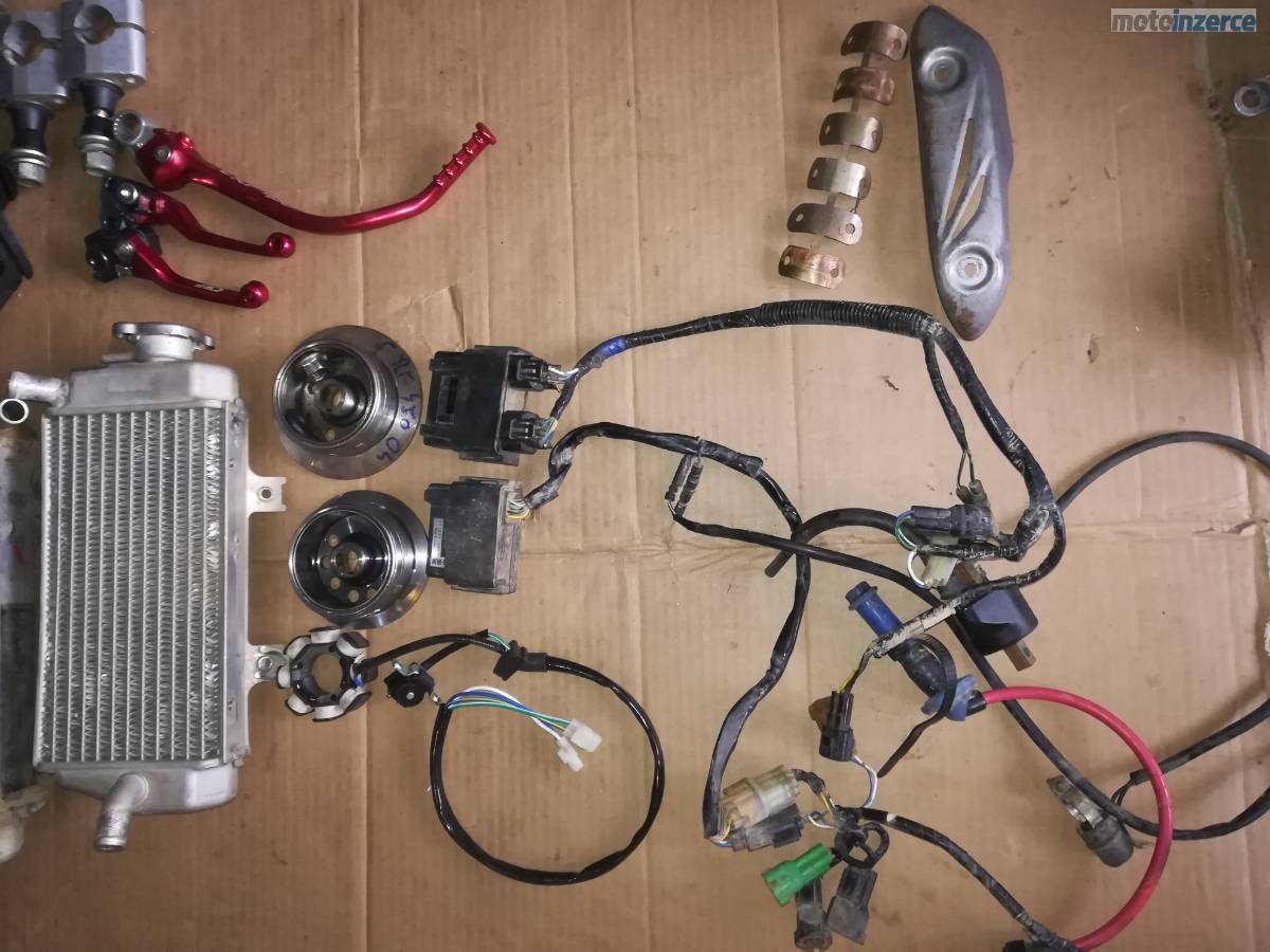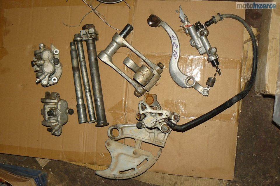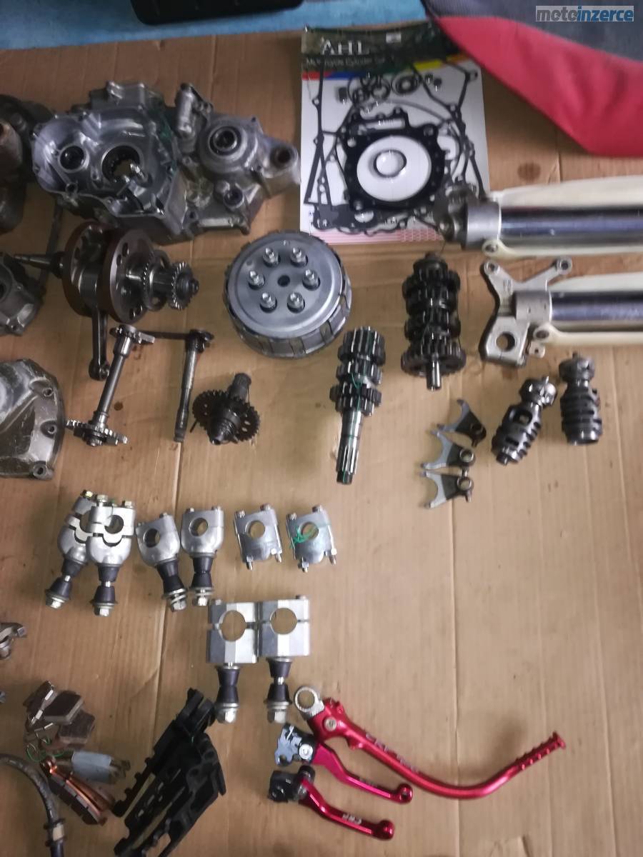 Kola 21",19",ram, podsedlovka, airbox, nadz, bryle, stupacky, kyvna vidlice, osky kol, brudy, chladice, plasty, riditka, klem riditek, viko ventilu, valec, levy karter, klikova hridel, vyvazovaci hridel, vacka, olejova cerpadlo, viko zapalovani, zapalovani cdi, indukcni civka, prevodovka, startovaci paka, radici paka