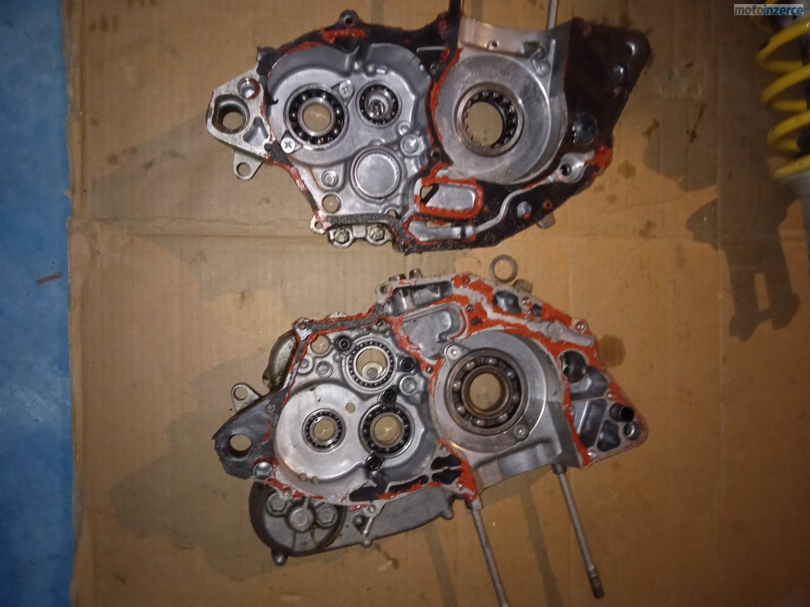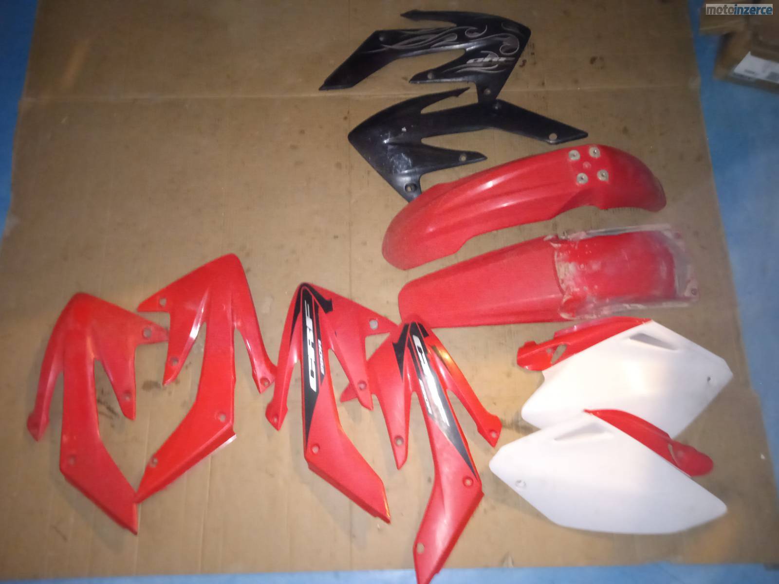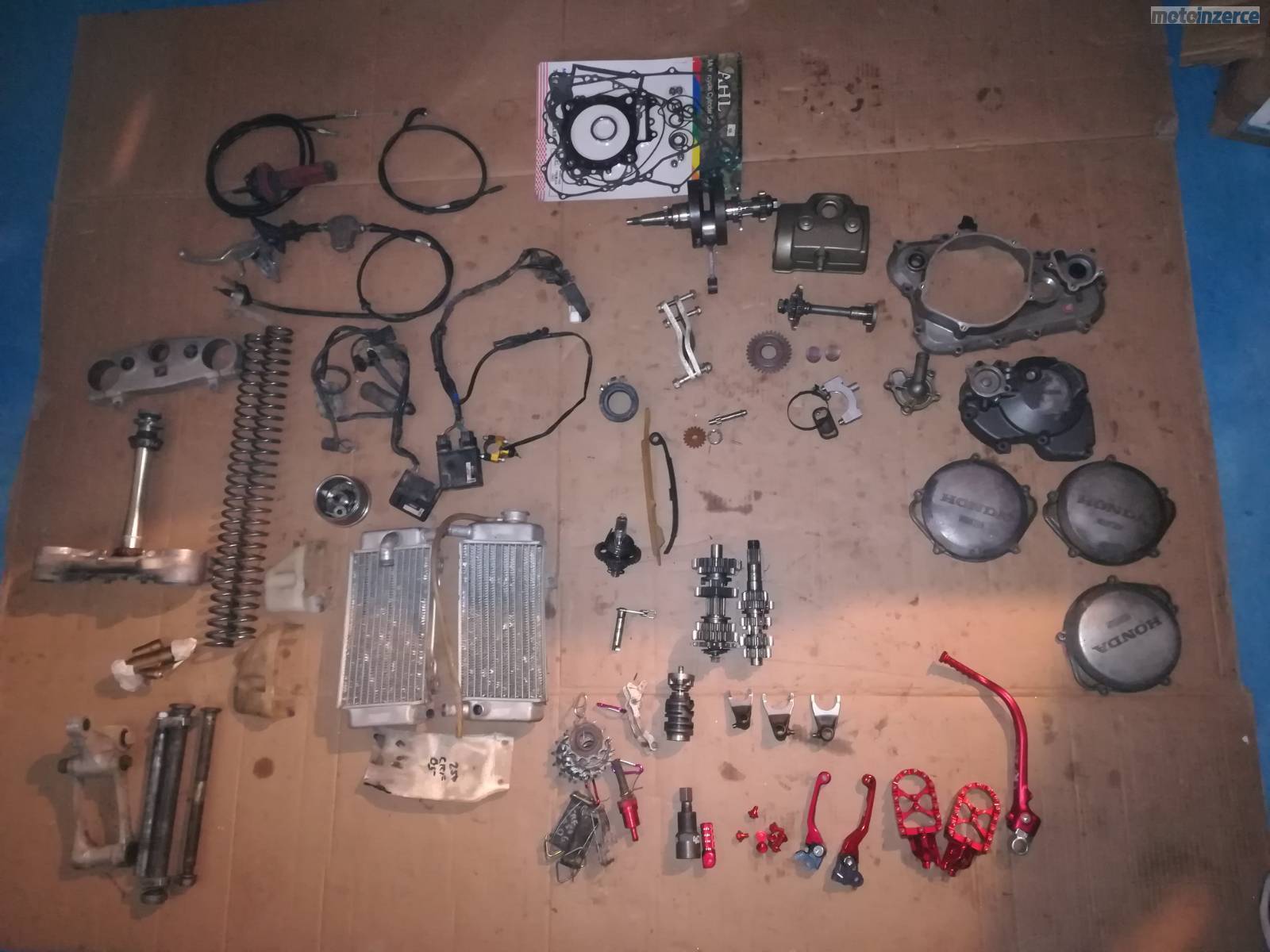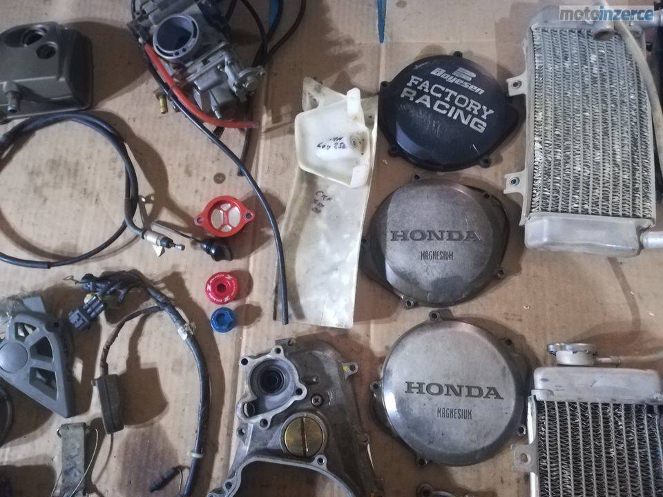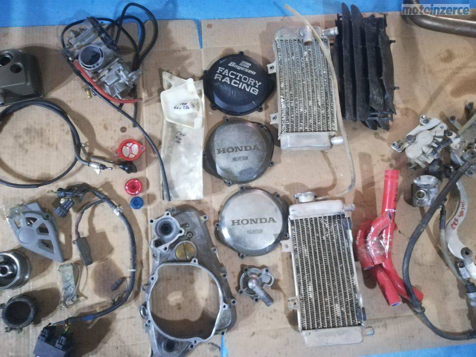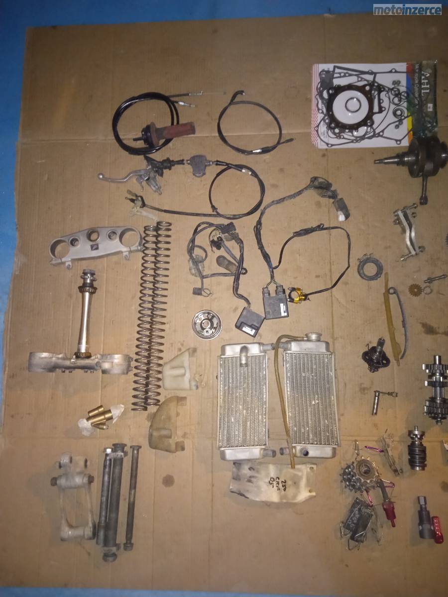 Kola21"a19",sedlo, podsedlovka, aifbox, tlumice, ram, plasty, vyfuk, bryle, brzdy, chladice, kartery, klikova hridel, spojka, olejove cerpadlo, vodni cerpadlo, prave viko karteru, prevodovka, radici mechanizmus, isa radici paky, osky kol, nadrz, stupacky