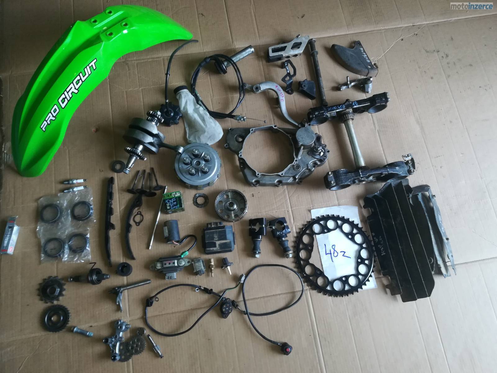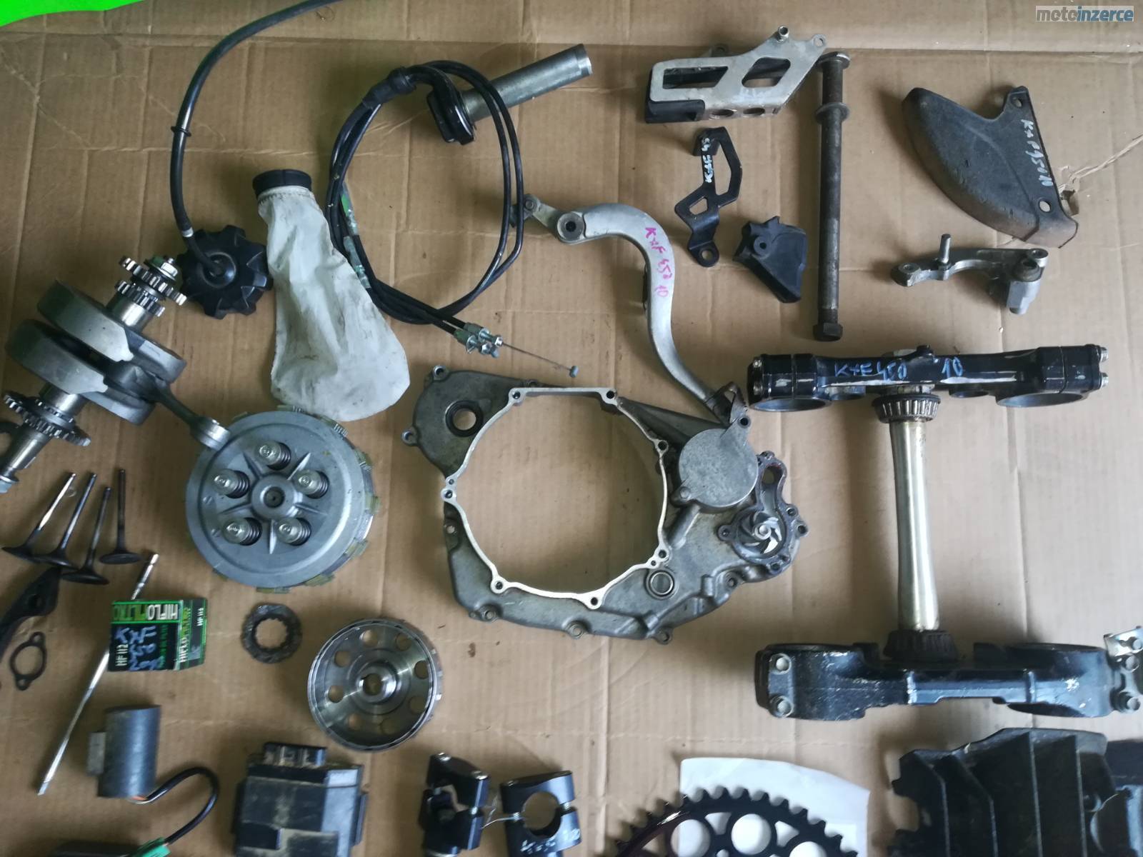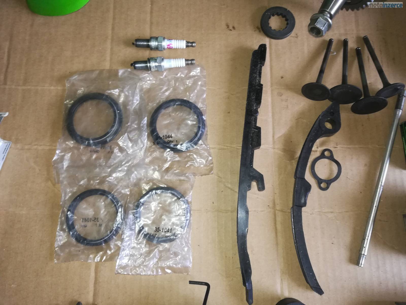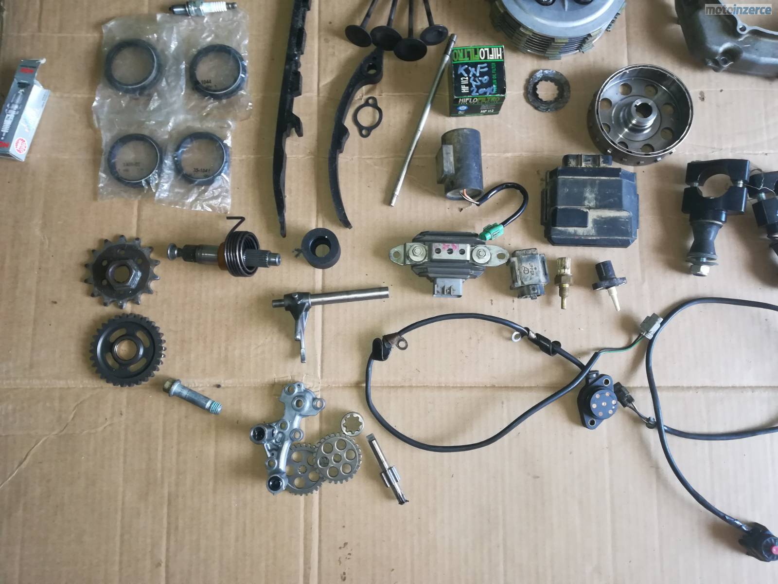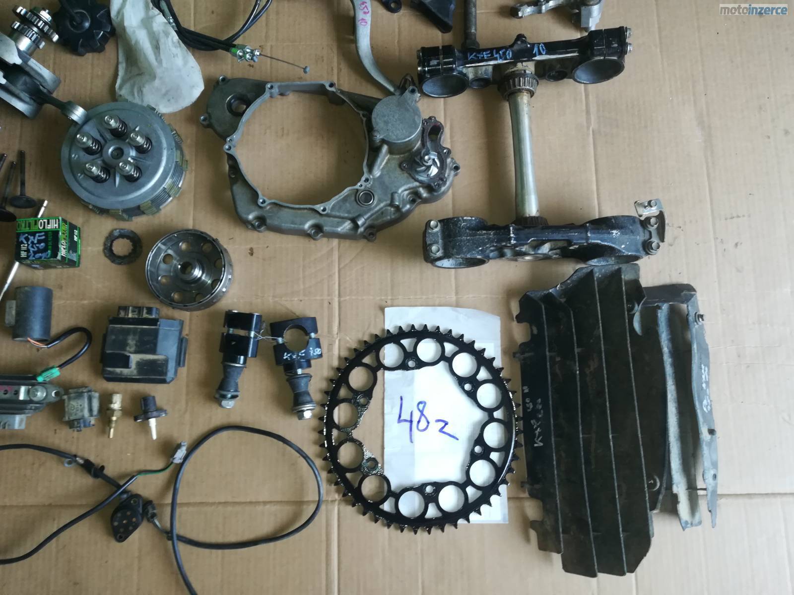 pr blatnik, cast spojky, klikova hridel, brle, napinak rozvodu, rozeta, kryty chladicu, cdi, klem prednich riditek, magneto rotor, pedal zadni brzdy, voditko retezu, voditko rotvodu, olejove cerpadlo, gufera prednich tlumicu, zapalovaci svicka, filtr oleje