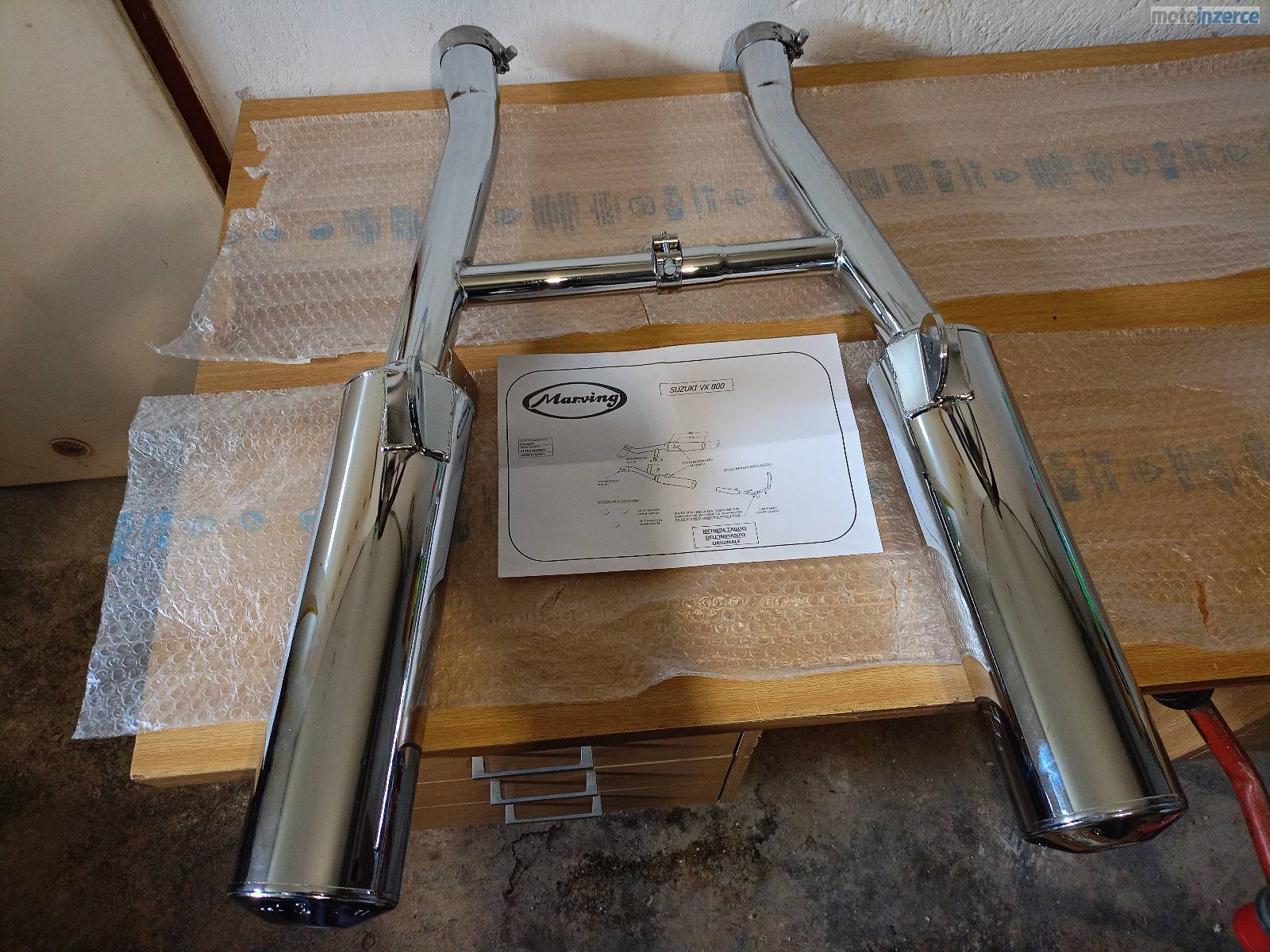 Prodám nové, nepoužité kopie originálních výfuků proslulé italské značky MARVING dělané na zakázku pro starší moto SUZUKI VX 800, tlumiče pravý + levý jsou v chromu, homologované s certifikátem náhrada za originál, bez svodů nejsou to laďáky. šroubové objímky 3ks jsou součástí balení a montážní návod + faktura. Původní cena 10 779,