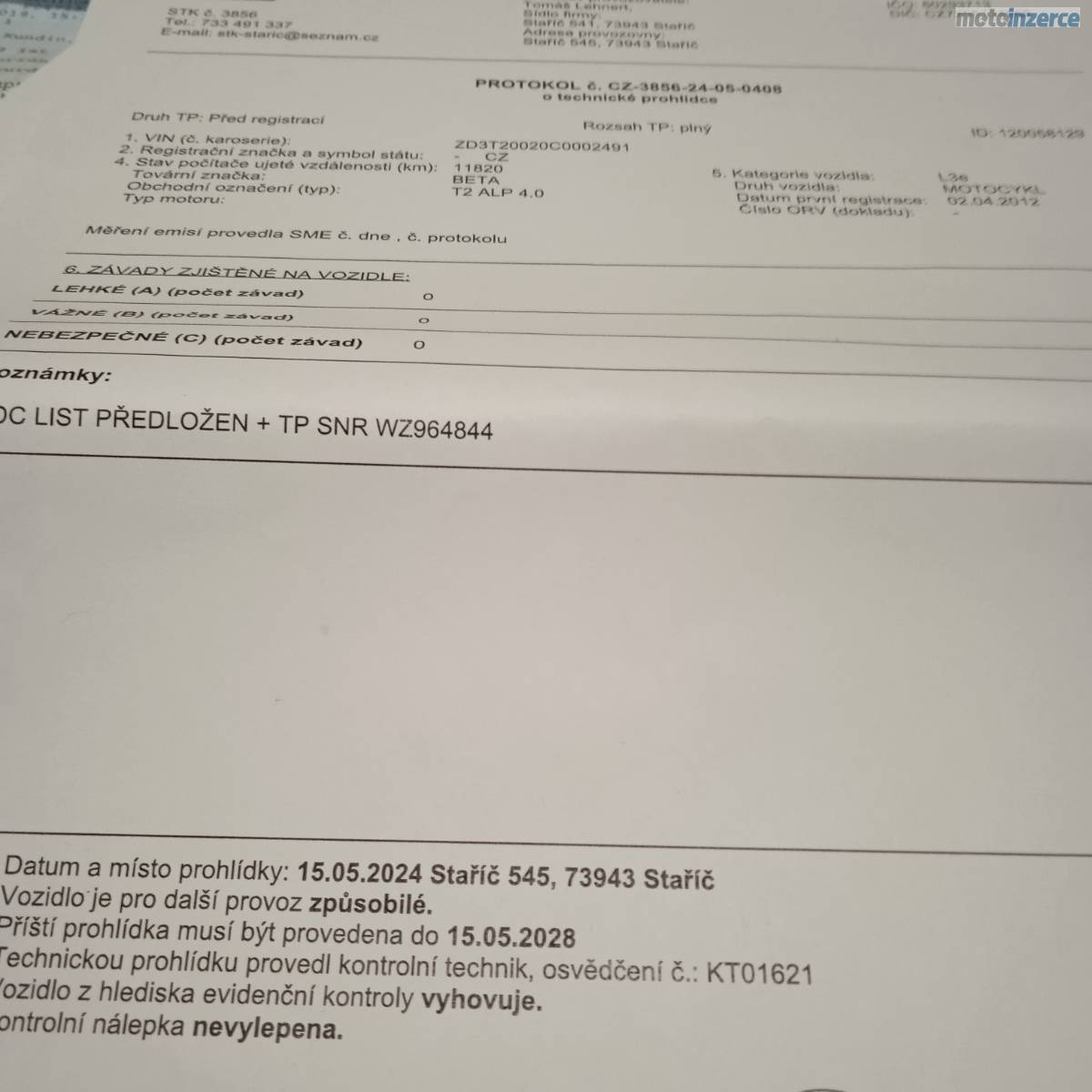 Prodám Betu Alp rok 2012… najeto necelých 12000 km. stav jako nová nevyužitá.. dovoz SRN březen 2024..pro syna najeto 300 km od té doby téměř nejeto… motocykl Nikdy nejetý v terénu.. koupeno od pána z Mnichova, který ji měl v karavanu a občas projel při dovolené… připravena na sezónu..bez investic….v případě dotazů volejte.