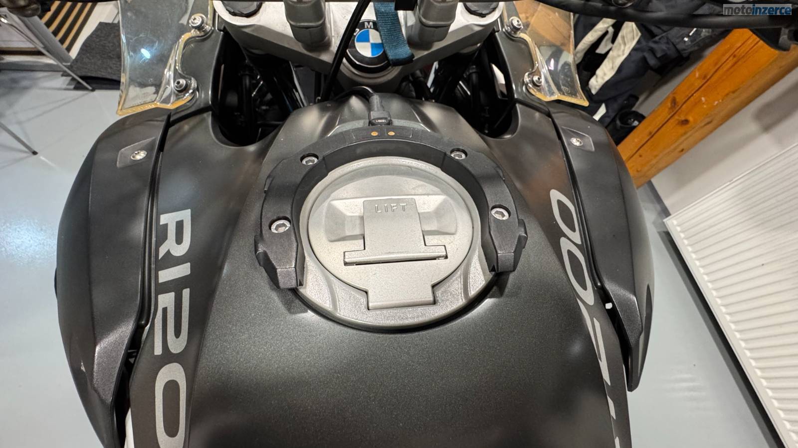 • Originál tankvak BMW s dodělaným připevněním na podkovu a integrovaným nabíjením