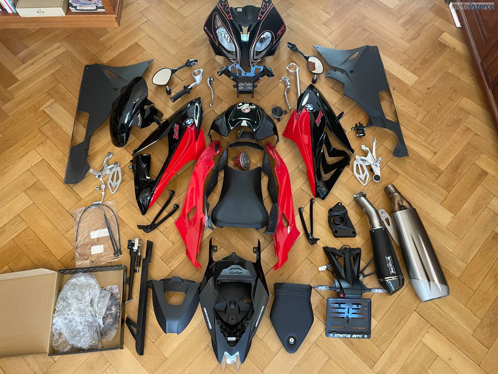 - mám k dispozici komplet originál kapoty BMW Black storm metallic / Racing red, světla a držáky, ovládací prvky, stupačky, svody, koncovka výfuku a další původní díly, koncovku REMUS Hypercone atd., vše cena dohodou