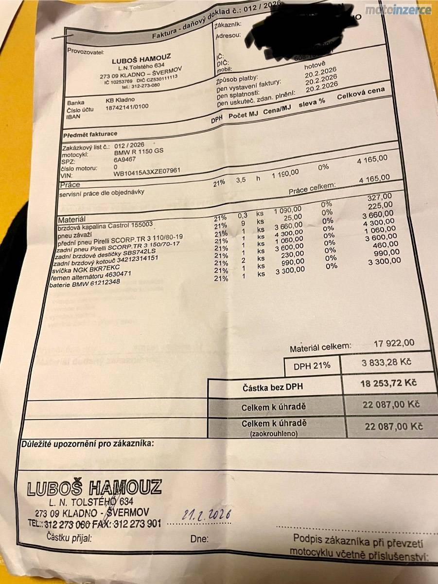 Na prodej GS 1150, masina po SERVISU za 22000kc!!!.NOVE PNEU PIRELLI, ORIG. Baterie BMW, zadni kotouc, desticky atd (foto faktury) K masine original bocni kufry + zadni case, servisni manual. Drobne kosmetické vady ale po technické stránce v skvělé kondici. Najeto 125 627 km. Masina k videni a vyzkoušení v prodejne kde byla servisována Lubos Hamouz Kladno.