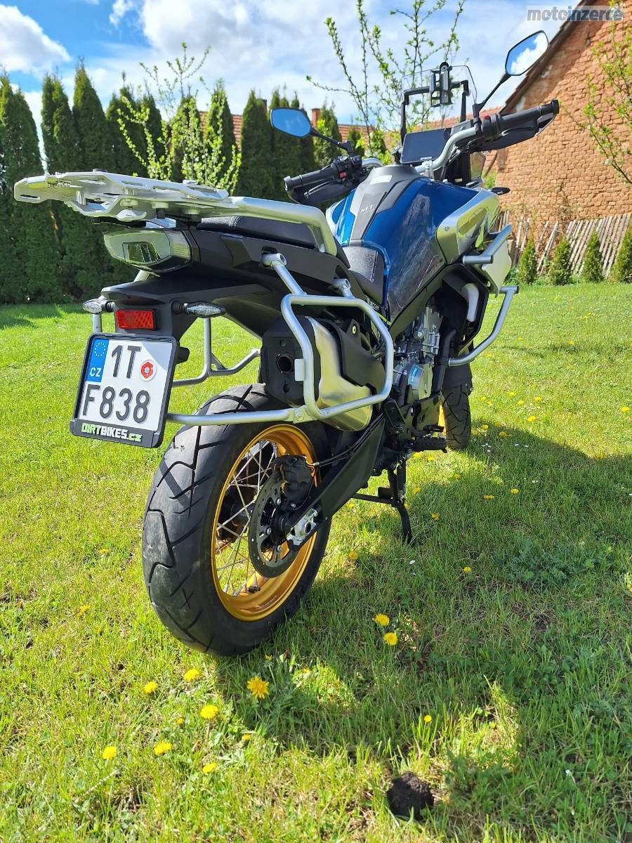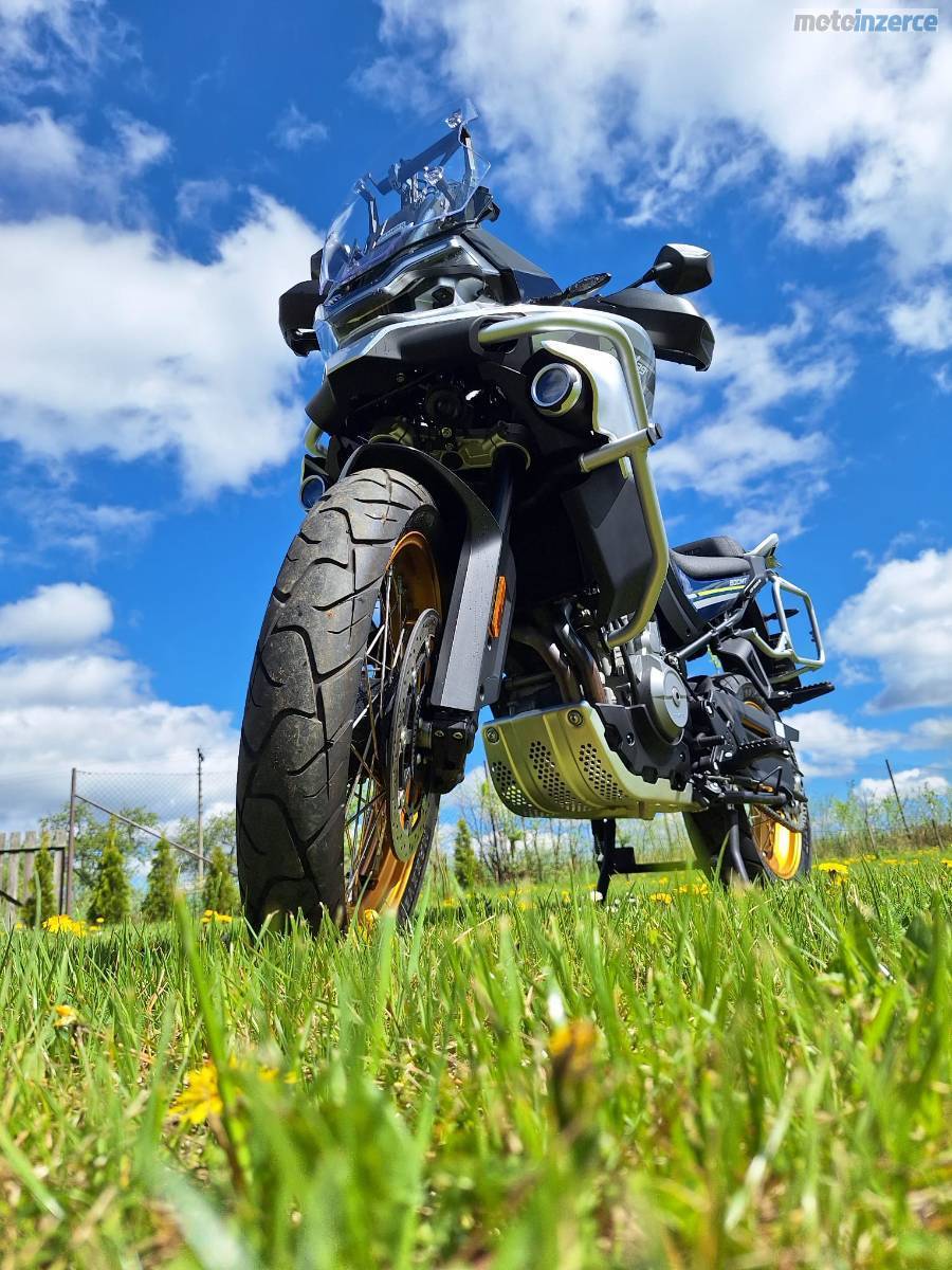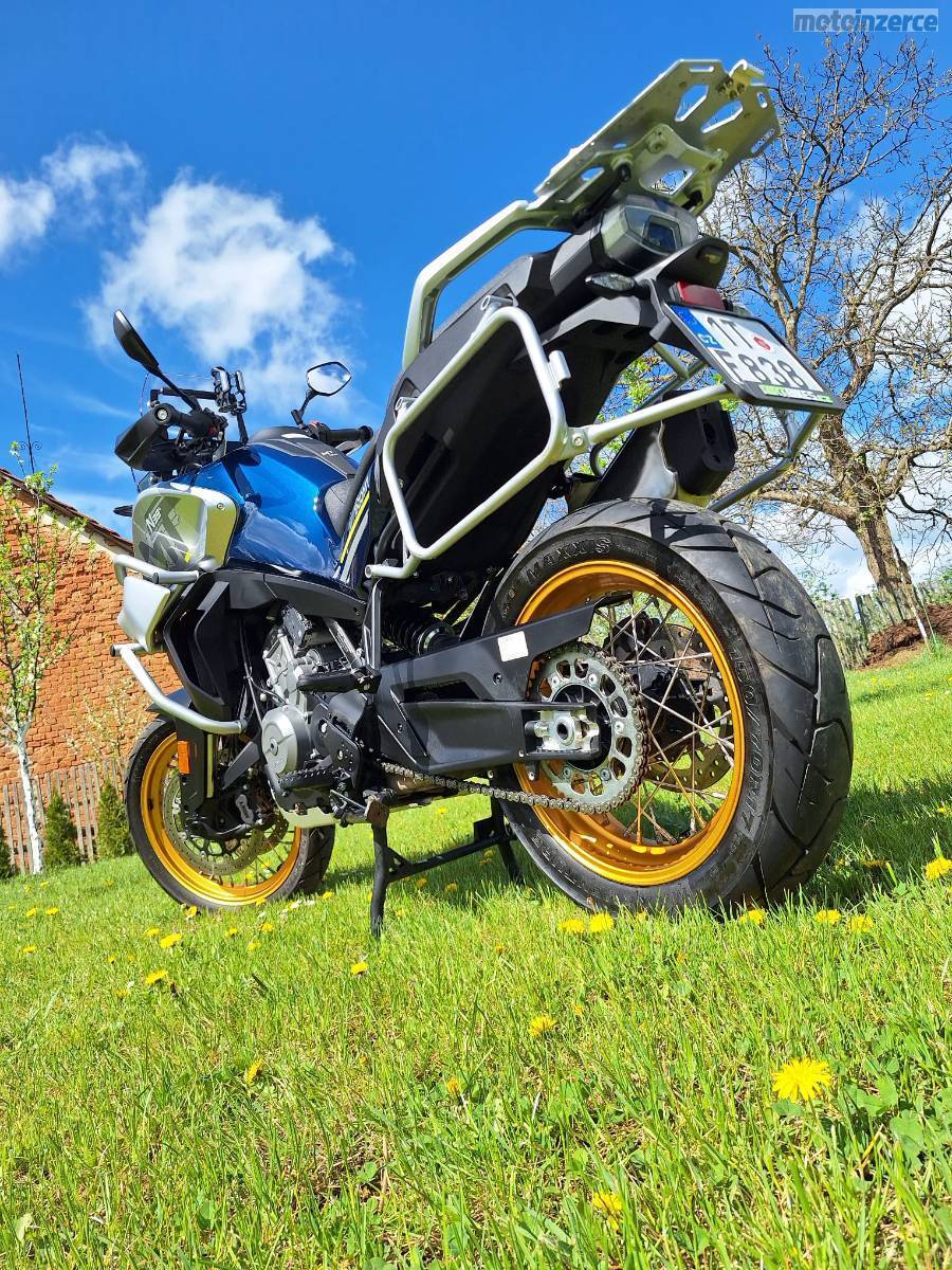 Špičkový podvozek díky obrácené vidlici a tlumiči KAYABA, kola s křížovými paprsky a pneumatiky Maxxis Adventure MA1 (110/80 R19 vpředu a 150/70 R17 vzadu): stabilita a bezpečnost za všech podmínek.