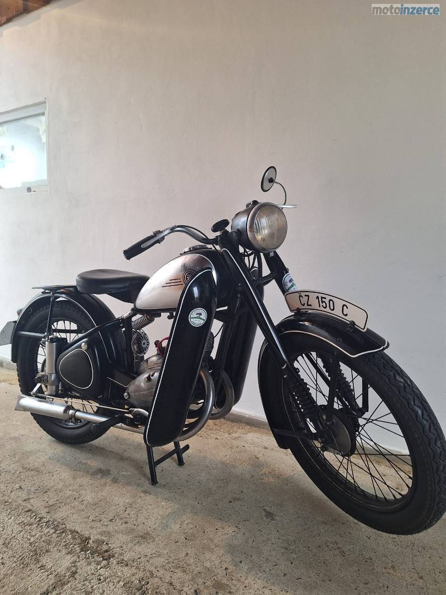 ČZ150C rok 1948. Po renovaci, revma plechy, náhradní nova kola plus výplet nové gumy, opraven tachometr, origo. velký technický průkaz, malá značka, STK 8/27. Ježděná po veterán srazech. Cena dohodou