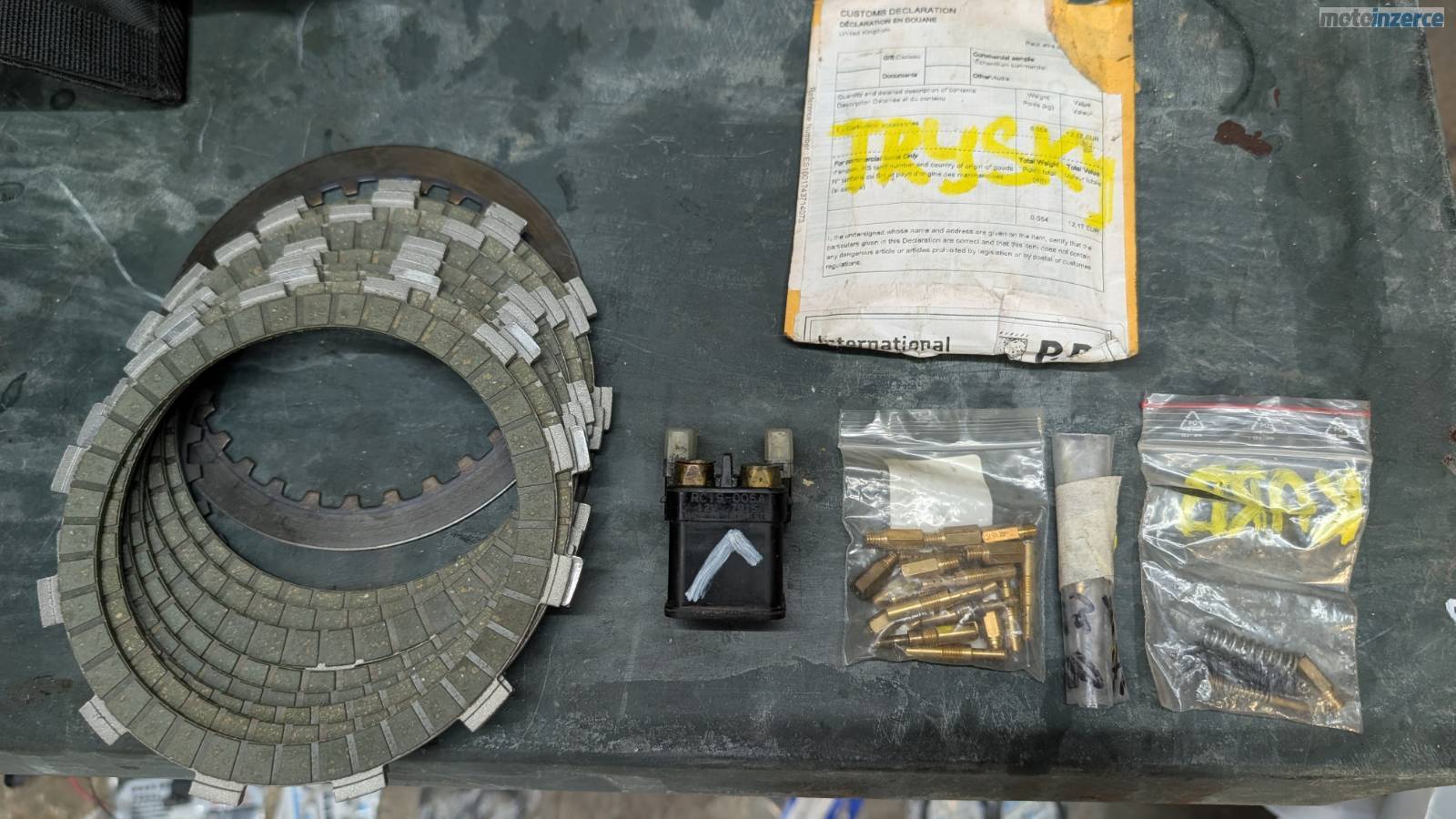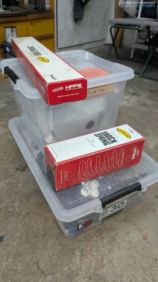 Sada původních pružin (na moto jsou pružiny na 100Kg jezdce), sada trysek karburátoru, startovací relé, rozeta, kryty motoru a rámu, víko vodní pumpy, víko spojky, pravý chladič, atd…