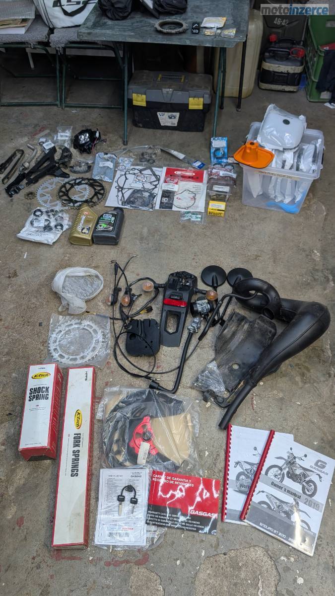 Dále k moto spousta NOVÝCH nepoužitých náhtradních dílů jako 7x vzduchový filtr, ložiska kol, pouzdra a prachovky tlumičů, zadní brzdová hadice, plynové lanko, brzdová páka zadní a přední, řadička, kompletní řetězová sada, sada těsnění motoru, fungl nové spojkové lamely, ložiska a gufera přepákování atd.