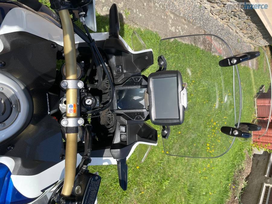 Navigace Garmin Zumo, kryt předního světlometu SW, přední deflektory, rozšíření bočního stojanu SW, orig. padací rám včetně přídavného osvětlení a tašek SW, box na nářadí, kompletní boční kufry a topcase SW s kanystrem a lahvemi na vodu.