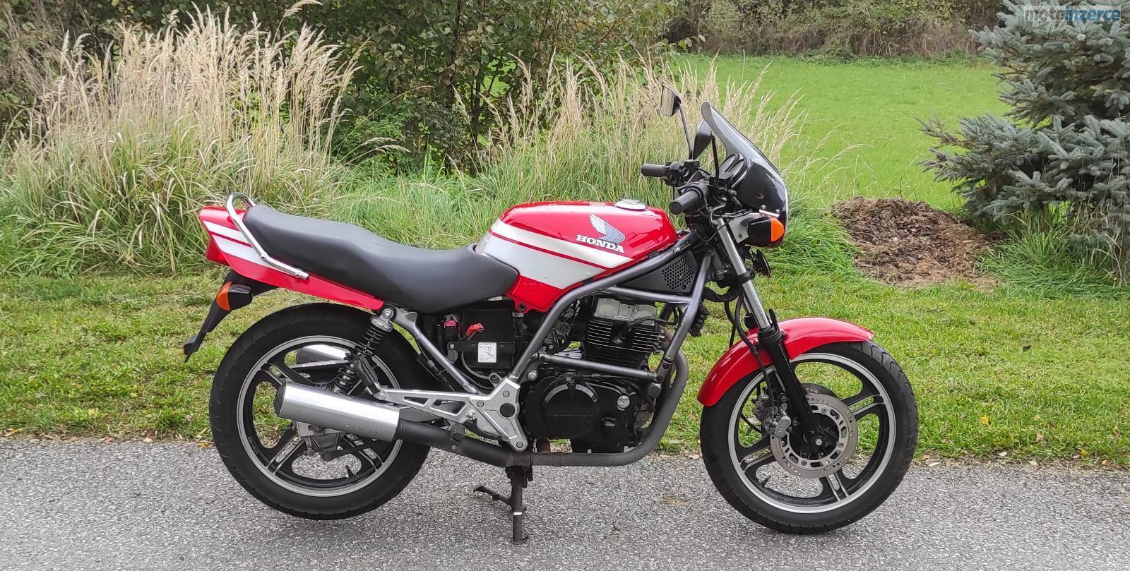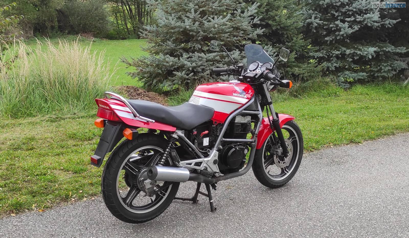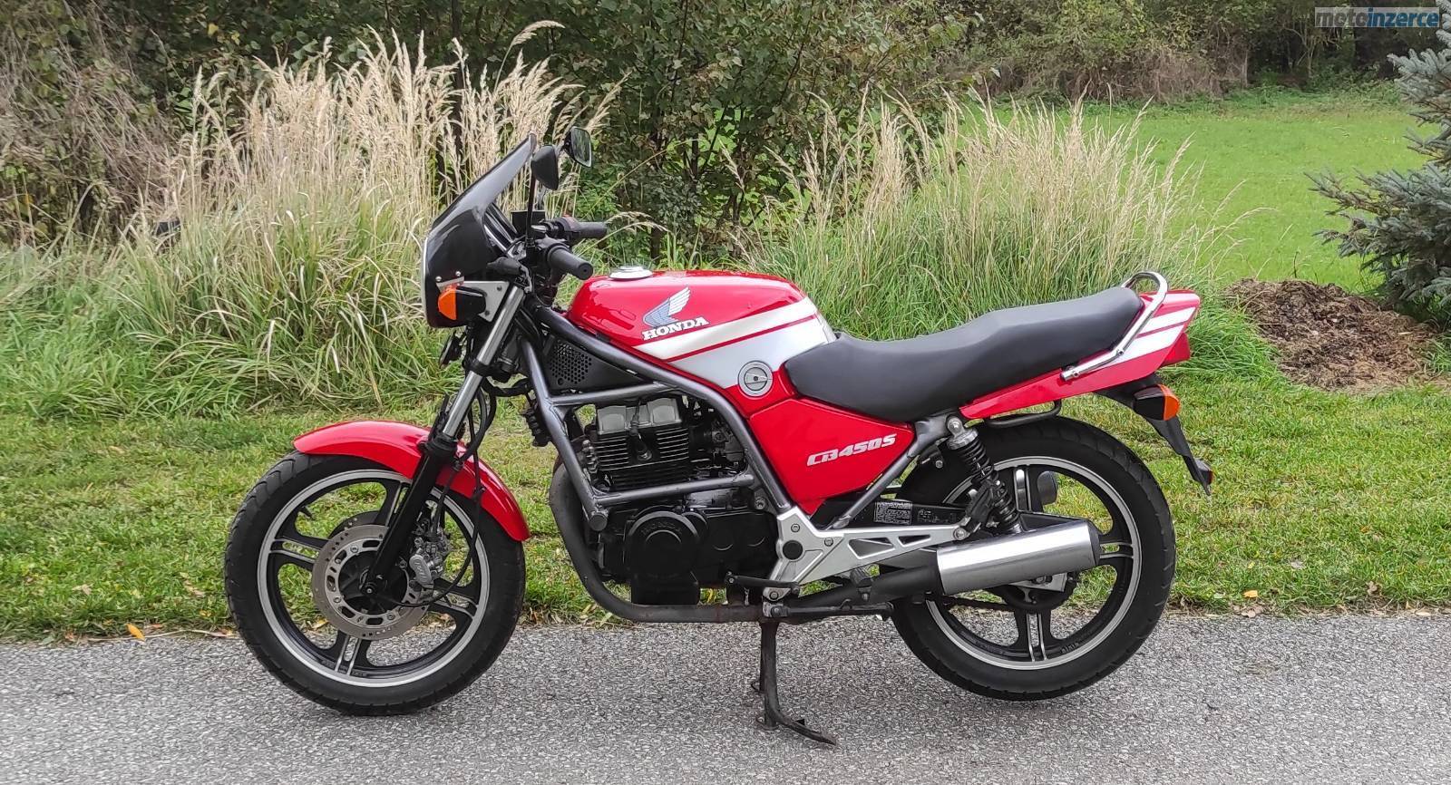 Honda CB 450 S r.v. 1989, výkon 32 kW, vhodná tedy pro řidičský průkaz skupiny A2, najeto doložených 54tis. km, nebouraná a nelakovaná, kromě zrcátek, rukojetí a plexi v původním stavu, pouze tři majitelé za celou historii, poslední ji měl 17 let, pneu ok, ale starší DOT, řetězová sada 70%, vyhřívané rukojeti, centrální stojan, plexi štítek Puig, kosmetické vady úměrné věku, delší dobu stála, nutné zprovoznění, na startsprej motor běží, kompletní německé doklady na přihlášení, bohužel chybí kryt baterie na pravé straně, spolehlivý motor, podobné moto jako Suzuki GS 500, také řadový vzduchem chlazený dvouválec, cena 17tis. Kč