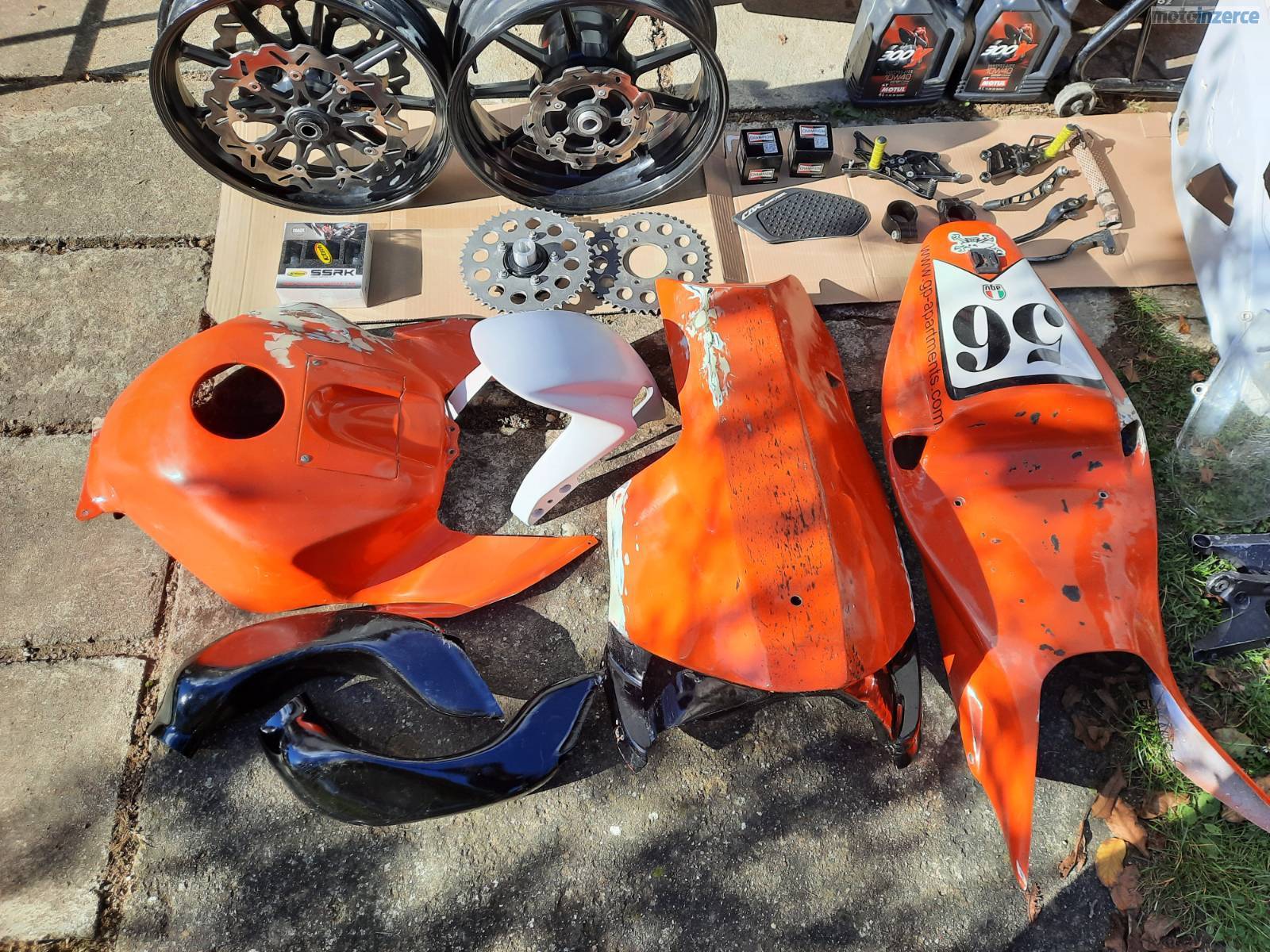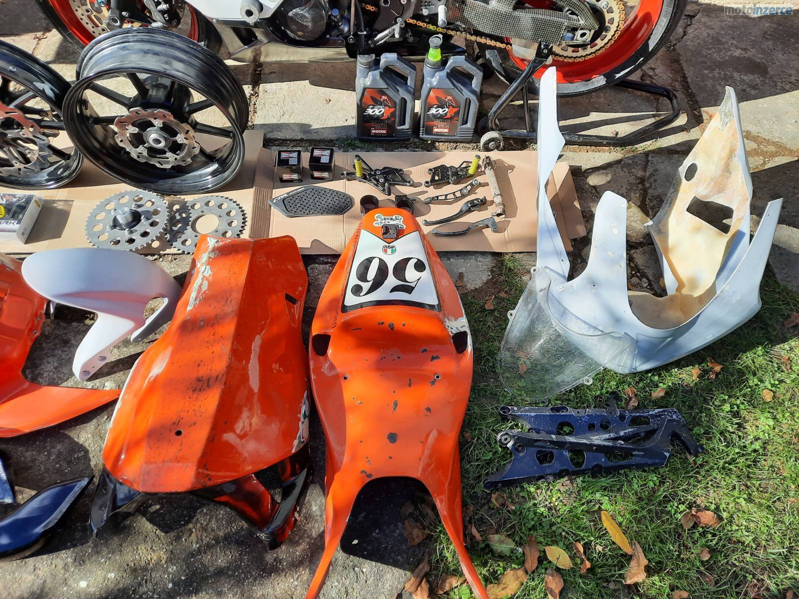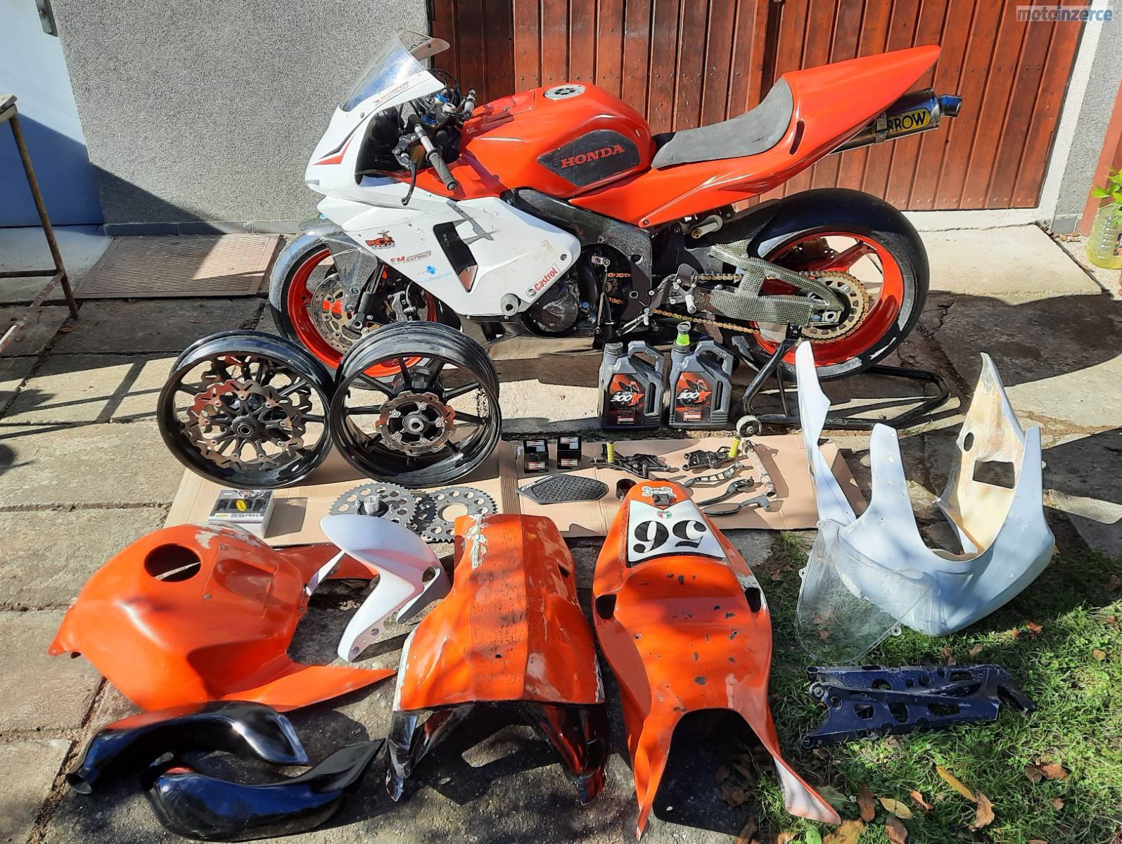 Prodám okruhovku Honda CBR600RR, motocykl má motor v úpravě supersport od pana Havlíka (na brzdě 130Hp, graf mám), přídavný chladič, plus dodatečné chlazení výměníku, antihoppingovou spojku, rychlořazení, upravená sací hrdla, přepákování, víčko nádrže, páčky a řídítka PPtuning, řídící jednotka Ignitech (nastavení pan Murárik), kompletní výfuk Arrow, carbonové kryty rámu a motoru, kevlarové na kyvce a zadní blatníček, ukazatel zařazené rychlosti. Zadní tlumič Öhlins, v předu pístková sada K-tech, řetěz DID520ERV, destičky Brembo RC. K motocyklu přidám: Druhý motor, také úprava od pana Havlíka (včetně altiku a zapalka, pouze sériová spojka), druhé ráfky Braking, druhá sada kompletních kapot, dvakrát plexi, páčky, přepákování SBK a nějaké drobnosti. 6l oleje Motul 300V, dvakrát olejový filtr. Motocykl není nový, má něco za sebou, kapoty opravované atd., je potřeba doladit pár věcí, ale jinak plně funkční. V případě zájmu, možno prodat druhý motor zvlášť za 20tis., sada ráfků Braking 12tis.