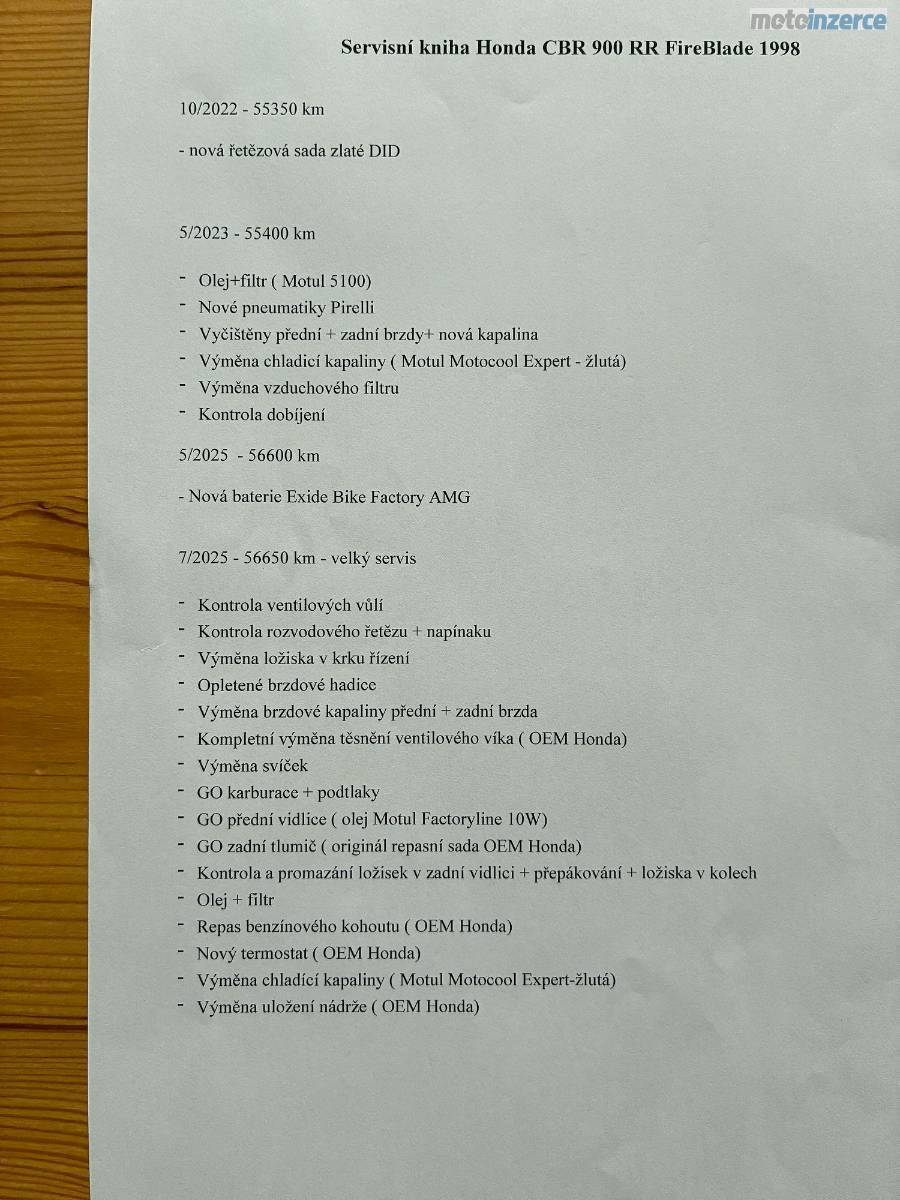 Letos jsem nechal na motocyklu udělat kompletní servis za téměř 50.000 kč, vše co bylo potřeba vyměnit nebo vyservisovat se udělalo v odborné dílně, mým cílem bylo, aby se technický stav přiblížil co nejvíce stavu nového stroje a dala se tak opravdu vychutnat jízda na tomto superbiku (před tímto servisem neměl motocykl žádnou vážnou závadu, téměř vše se dělalo z důvodu stáří-např. brzdové hadice, pryžové díly, repase předních a zadních tlumičů, GO karburace atd). Na ničem jsem nešetřil, vše co šlo koupit originál Honda jsem koupil. Nyní je tato motorka opravdu bez investic. K motocyklu je originální nářadí, manuál, dva klíče, kód, protokol TUV a spousta faktur a dokumentů ze servisu. V německu byla motorka servisována v oficiálním servise Honda. Motorka jede a vypadá skvěle, Cena 79000 kč. Motocykl je vhodný do sbírky nebo pro někoho, kdo si chce užít opravdovou silnou mašinu z ikonických devadesátých let. Určitě je to však skvělá investice. Po dohodě možný dovoz.