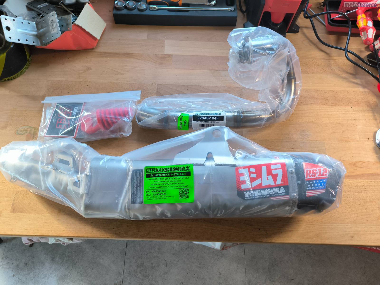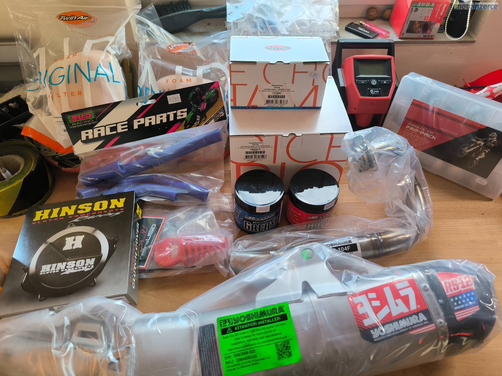 Komplet výfuk Yoshimura, filtry, plasty, sady polepů, víko spojky Hinson, stojan pod moto, větší kit box pro sání atd…