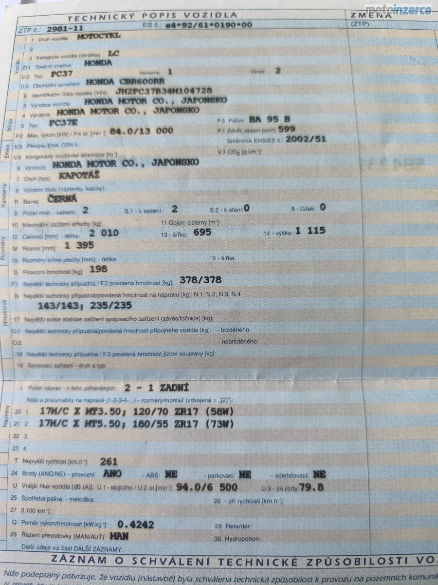 Prodám Hondu CBR 600RR (generace PC37), rok výroby 2004. Motorka má poctivý nájezd pouhých 33 600 km. Posledních 6 let byla nevyužitá a uskladněná v suché garáži. Nyní je kompletně probuzená a připravená na sezónu bez dalších investic.