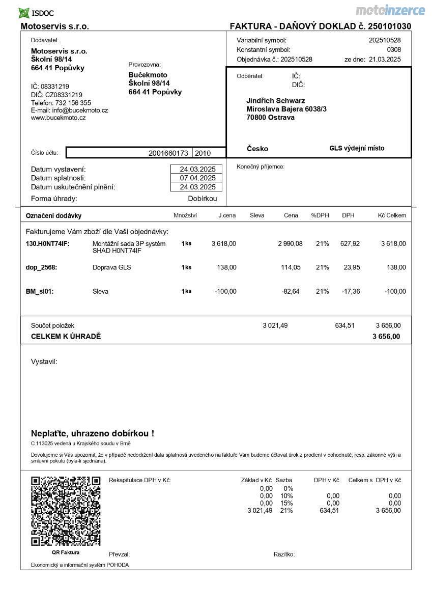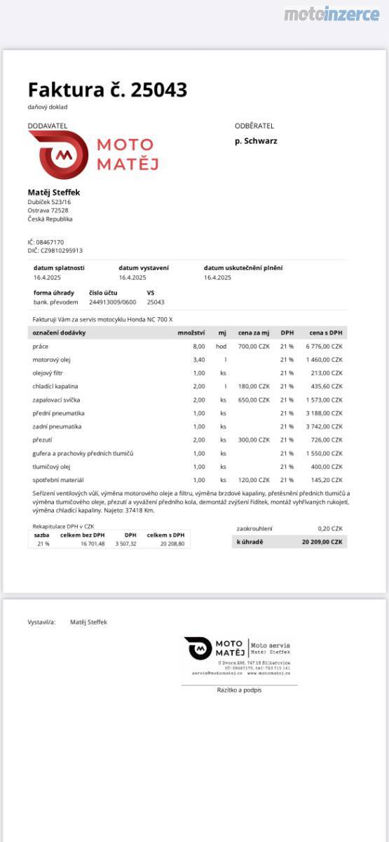 Motorku jsem koupil loni v březnu s nájezdem 37 tis., nechal na ni udělat velký servis za více jak 20 tis. Kč (viz faktura):