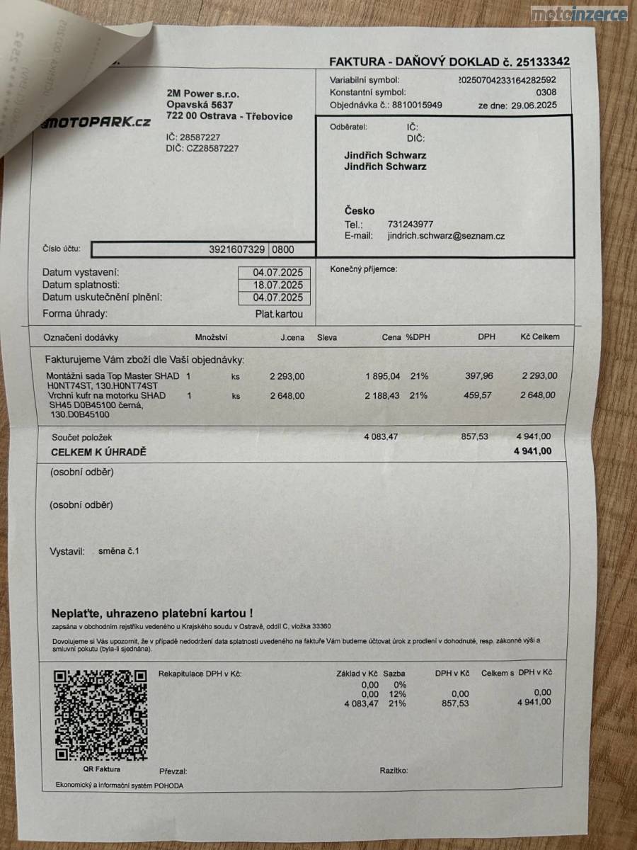 - nové držáky bočních kufrů a horního kufru cena 6000 Kč