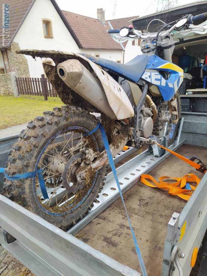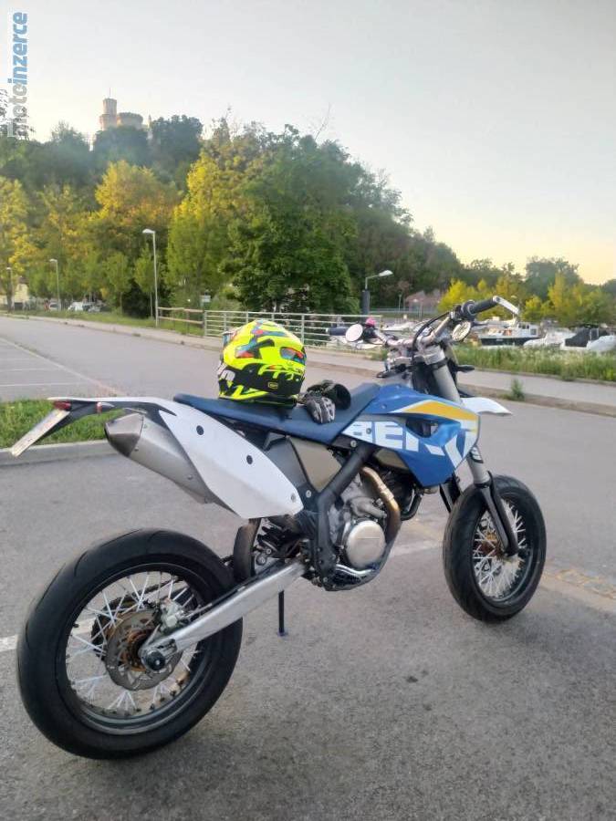 Zdravím, prodám HSB FE570, mám ho od roku 2017, historii předemnou těžko soudit (při koupi neměl magnet v kotouči – budík nepočítal), mnou měněn olej max do 15 mth, při 230 mth dělaná vodní pumpa, 270 mth větší servis – rovnaná hlava, rozvoďák, kontrola vůlí, rám do tmavě fialové metalízy. Teď čerstvě měněno těsnění s distančním válečkem na výstupní hřídeli (letos sem s bergem byl v Albánii a byl to slušněj průtokovej ohřívač oleje). Také jsem teď prvně dal Valvoline místo Castrolu -> začala klouzat spojka, všechny ty roky předtím sem s ní problém nikdy neměl. Kupoval sem jako čisté FE, dosti zbídačené, takže tomu bohužel odpovídá i stav když člověk začně obcházet motorku vice z blízka, předchozí majitelé neměli asi momenťák ani cit ruky, takže je bohužel ztrhaných pár závitů jako je šroub na víku olej. filtru, nebo některé z držáků krytů vidlic. Kompletně utrhaná byla i vývodka z nádrže, takže ta je sešroubovaná s ocelovým rámečkem a podlepená těsněním na nádrže (udělané hned po koupi) stejně tak jako nová palivová pumpa – za všechny roky sem neměl s palivem nebo jeho netěsností problém. Podvozkově kompletně FE, jediná změna je hustější olej ve vidlicích. Motárdová kola jsou 17ky, nejsou zapsána v TP, přední kotouč 320 s adapterem pro původní brzdu, na držáku rozety je prasklina, která se od roku 17 nepohla (předpokládám, že z lisování ložiska), Endurová kola mají horší ložiska a gumy jsou téměř nové. K bílým plastům (párkrát jeté) přidám i staré a hodně bídácké “tašky” s tankpadem a kupu náhradních dílů. V případě nezájmu budu řešit na jaře olej (kvůli spojce) dávat novou baterii a dále používat jako víkendovku.