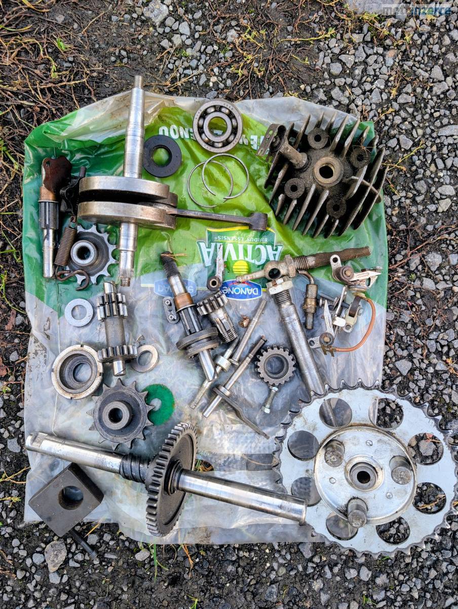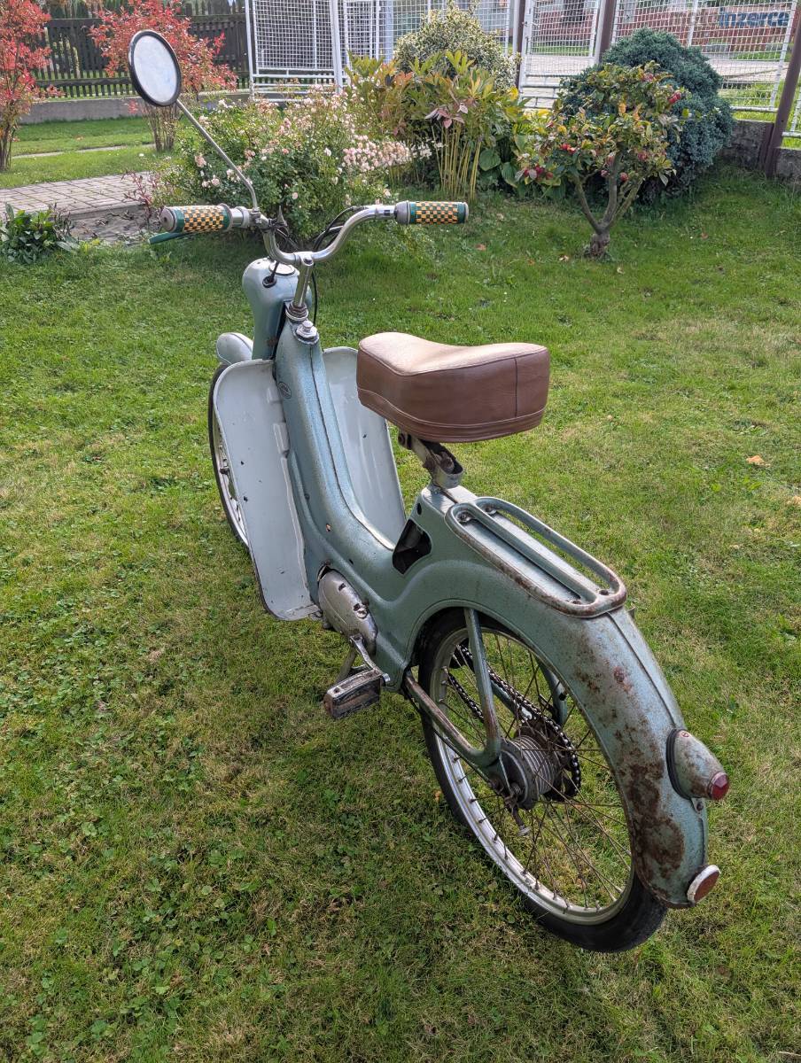 Jawetta 551, původní stav, původní kladívková barva. Rez na blatnících a špicích. 30 let téměř jen stála, teď jsem ji oživil po 13-ti letech, jede, řadí, ale potřebuje pořádně uvést do provozu a pročistit. V podstatě kompletní a původní, chybí kryt řetězu a krytka rámu u výrobního čísla. Celou dobu v rodině, dědictví. Plus díly na fotce, hlava, klikovka, části převodovky.