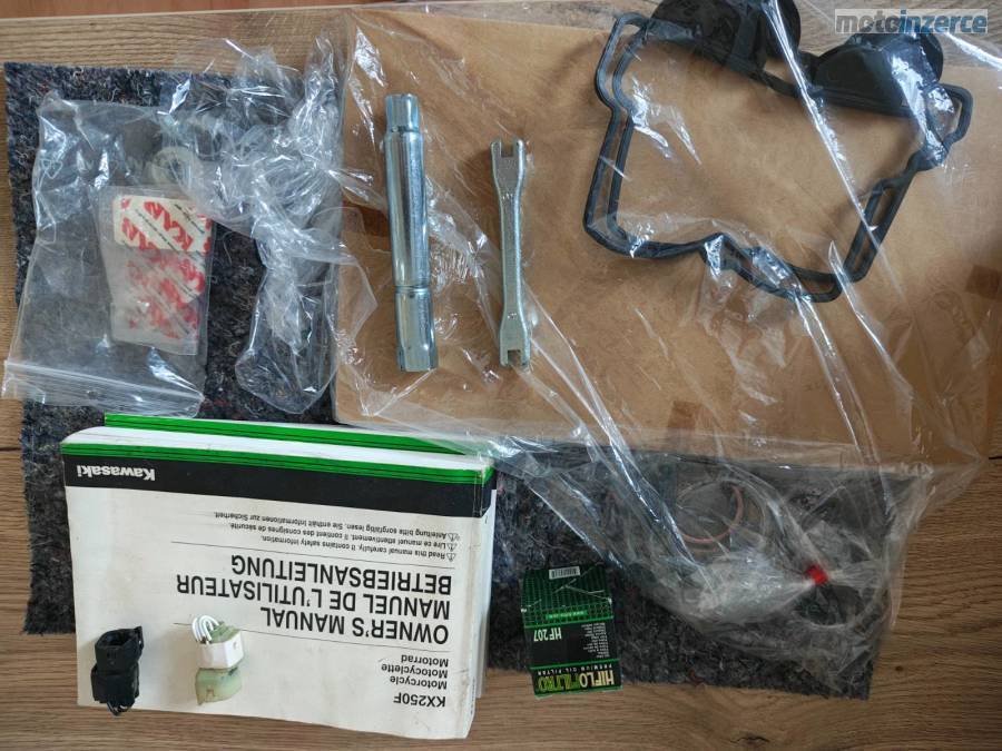 Přidám 6l oleje, 3 olejové filtry, stojan na moto, a vše co bylo součástí příbalu (manuály, výkonové mapy, nějaká těsnění)