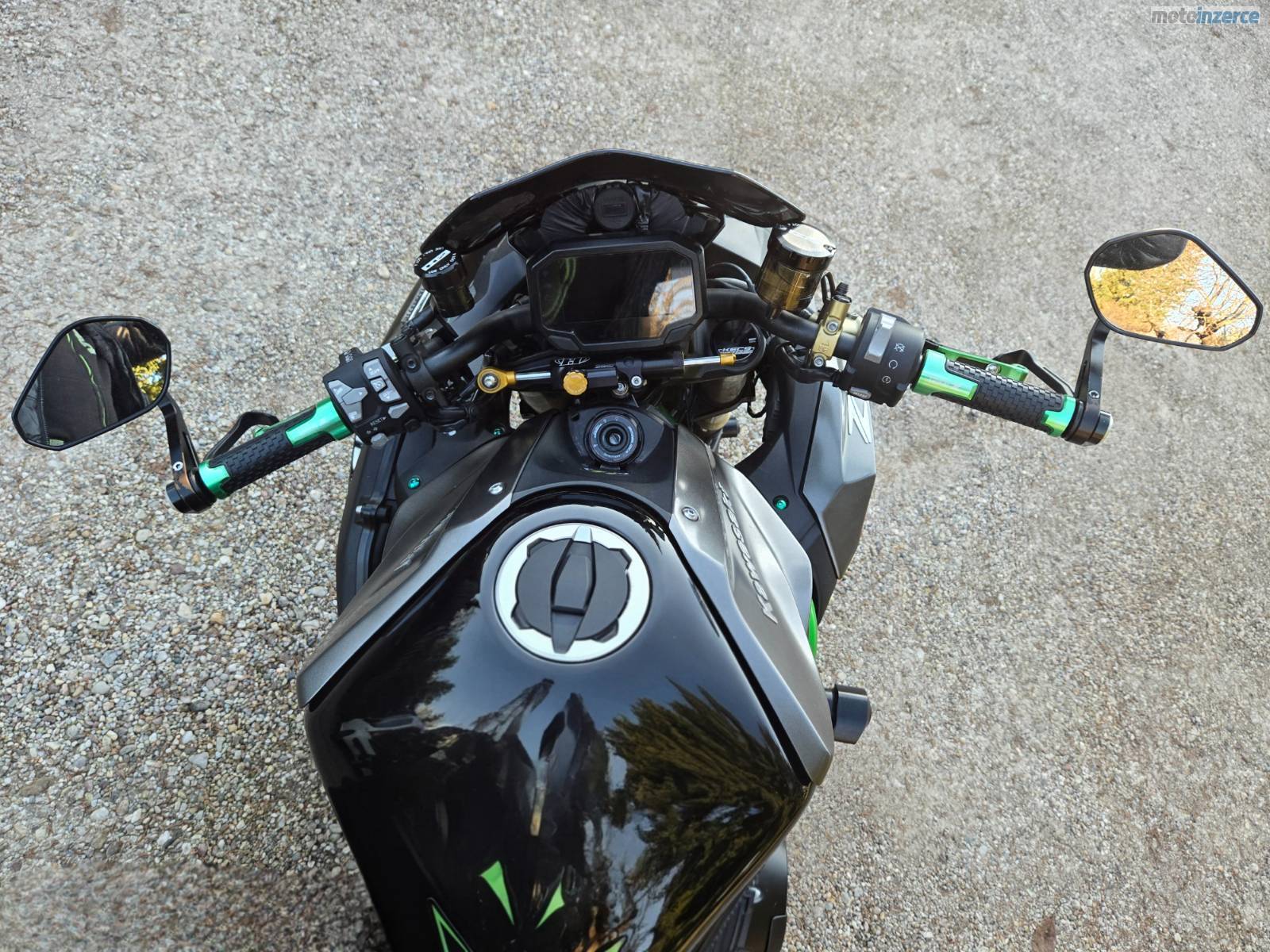 Doplňky viz foto. Vyfuk cobra s homologací vč. certifikátu o homologaci. Tlumič řízení Hyperpro. Hliníkové rukojeti, páčky stavitelné CNC, zrcátka v řidítkách homologované. Padáky motoru dvoubodové, padáky v hřídeli předního kola, padák u výfuku, rolny, Zvýšený přední větrný štítek. zásuvka USB s dvěma porty, Pneumatiky přední 30% zadní 50% pruměrně na moto vydrží pneu cca 7 8 tisíc km. Destičky přední, zadní cca 70%, kratší zadní držák SPZ + zadní blatníček, krovka zelená navíc. Veškeré původní odmontované díly přidám k motocyklu.