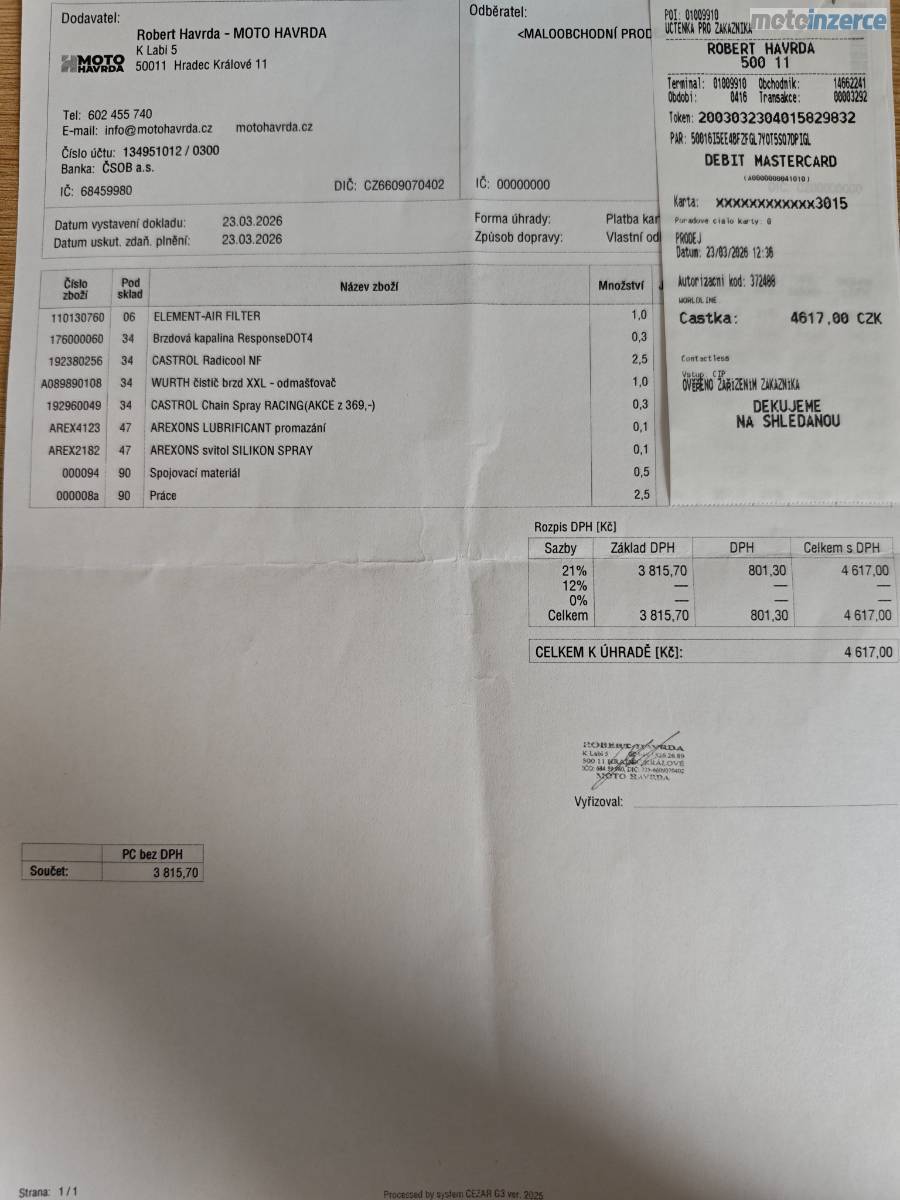 Aktuálně po servisu výměna všech provozních kapalin, nový vzduchový filtr, kontrola a napnutí řetězu.
