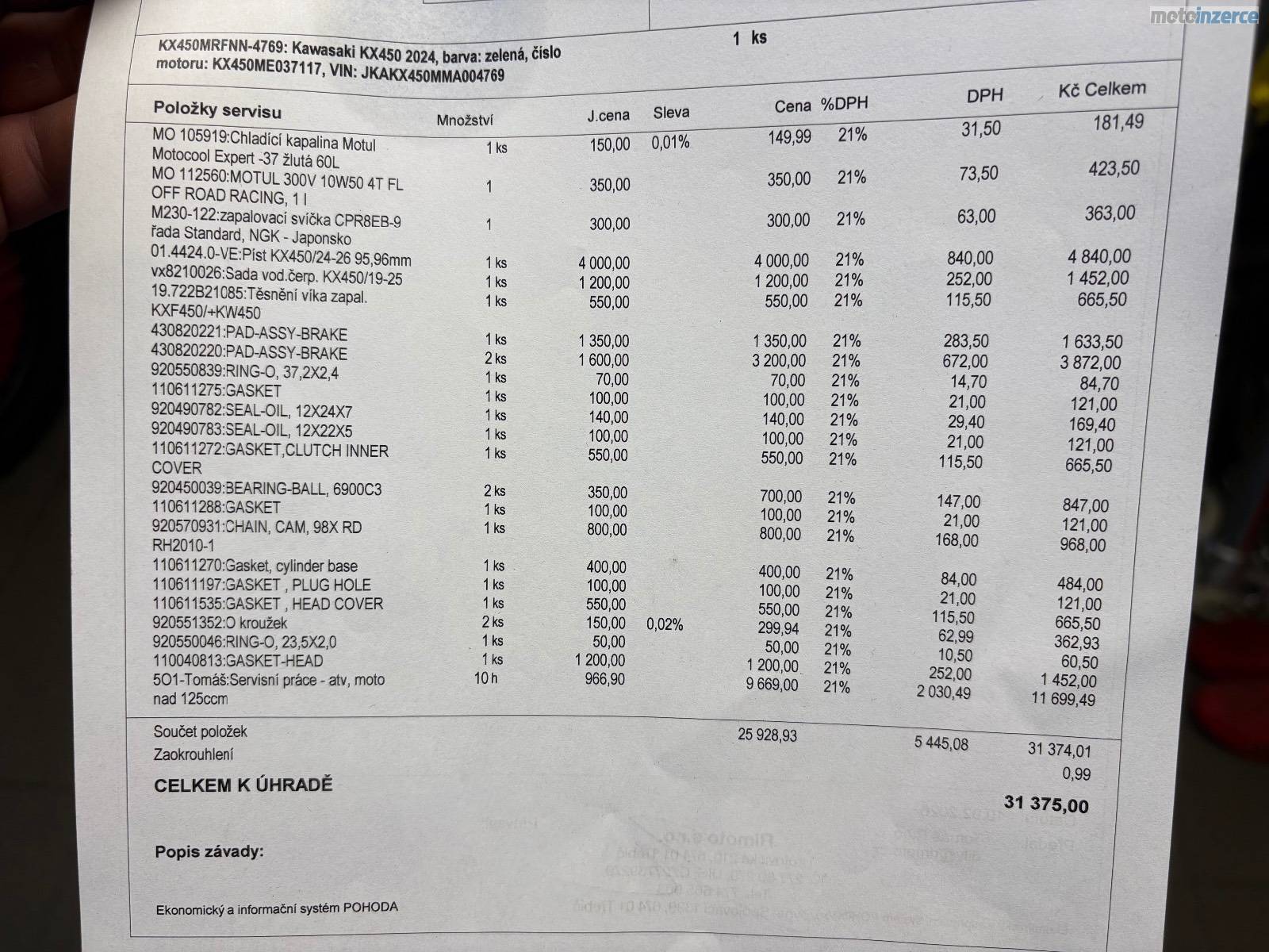 V 70-ti hodinách preventivně udělaný servis přímo v Kawasaki (pist, rozvodak, vodní pumpa, svíčka, ventilové vůle atd.) mohu doložit starými díly i fakturou