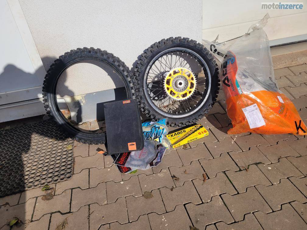 Dvě sady plastů, dvě úplně nový rozety, pár filtrů, přední nejetou pneumatiku a komplet zadní kolo s nejetou pneumatikou.