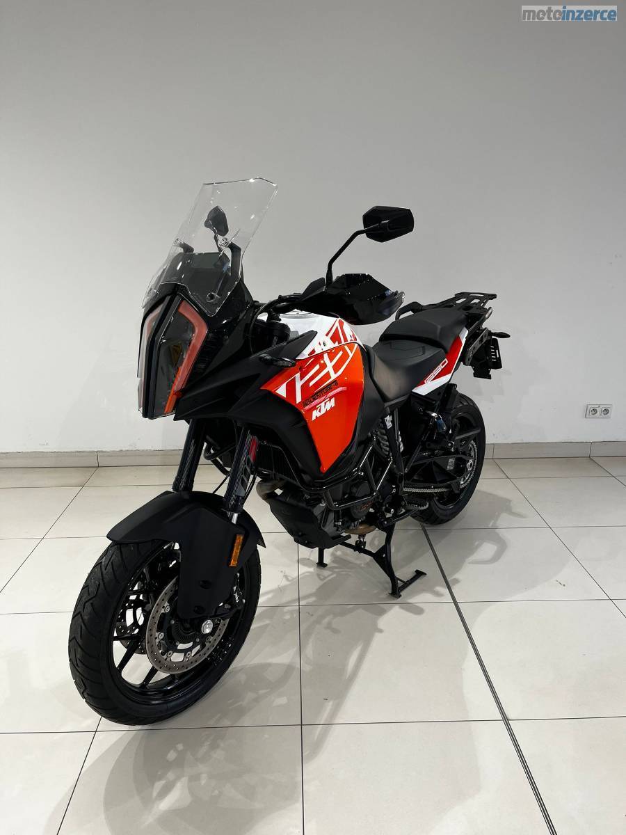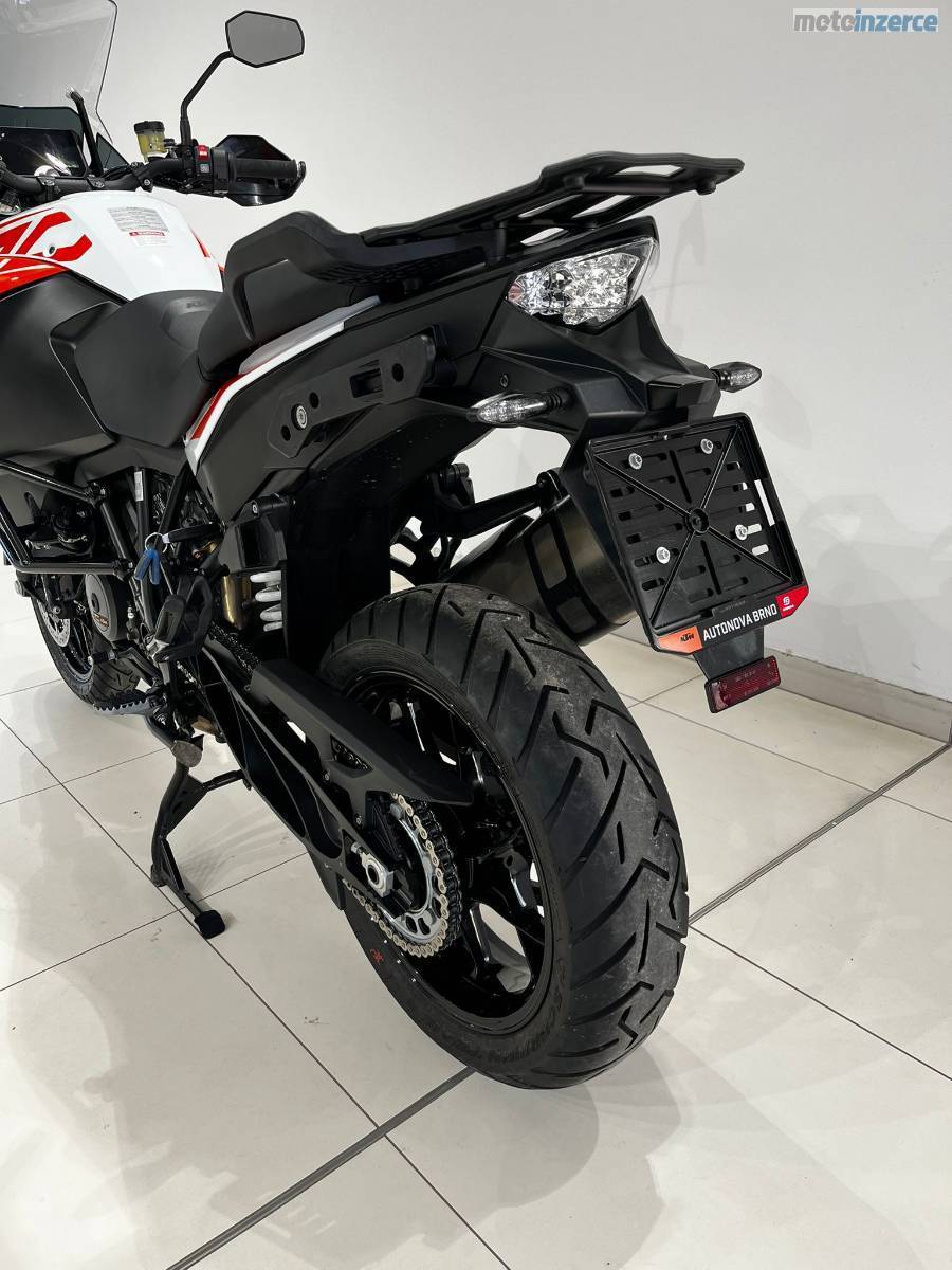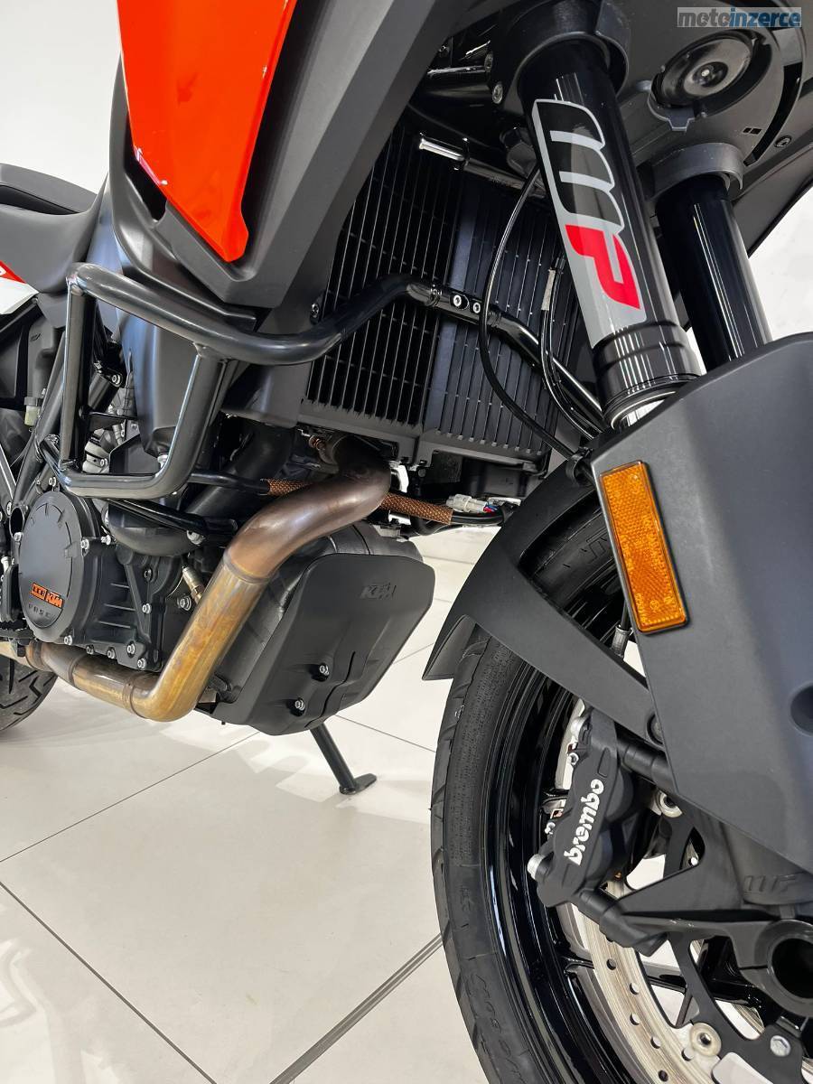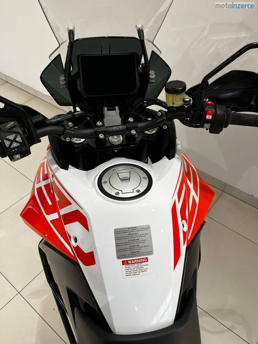 Nyní po velkém servisu: velká servisní prohlídka v 30 000 km (ventilové vůle, svíčky, vzduchový filtr, motorový olej, celková velká prohlídka), repas předních vidlic, výměna ložiska krku řízení, výměna brzdových kapalin, nová chladící kapalina, nová baterie YUASA ETZ14S provedeno v autorizovaném servisu KTM AUTONOVA BRNO. Další servis dle předpisu výrobce motocykl čeká za 15 000 km nebo za 1 rok. Řetězová sada má aktuálně najeto necelých 10tis KM je tedy zhruba v polovině životnosti. Vzorek pneumatik přední 4 mm, zadní 6,5 mm (měřeno ve středu běhounu) Pirelli Scorpion Trail 2. Stroj nyní nepotřebuje žádné investice. Originální stav. Hezký moderní infotainment, lze propojit s telefonem a využít Turn-by-turn navigaci přes aplikaci KTM. Schránka na mobilní telefon s USB nabíječkou. 12V zásuvka pod přístrojovou deskou. Základní hliníková plotna pro montáž originálního topcase kufru KTM.