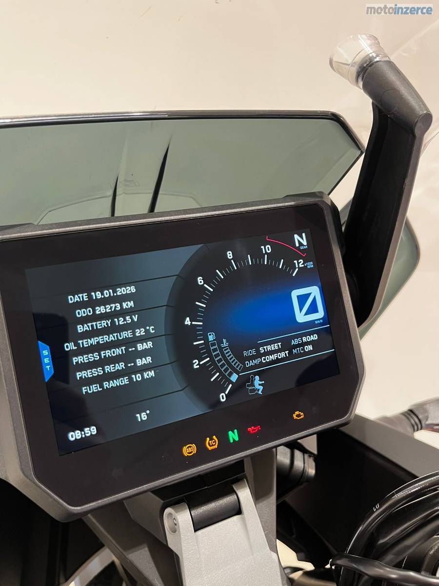 Výbava: tempomat, el. podvozek, jízdní režimy, výškově stavitelné plexi, ridebywire plynová rukojeť, plastový malý kryt motoru, boční držáky originálních plastových kufrů, centrální stojan, elektronický podvozek 3 režimy, snímače tlaku v pneumatikách.