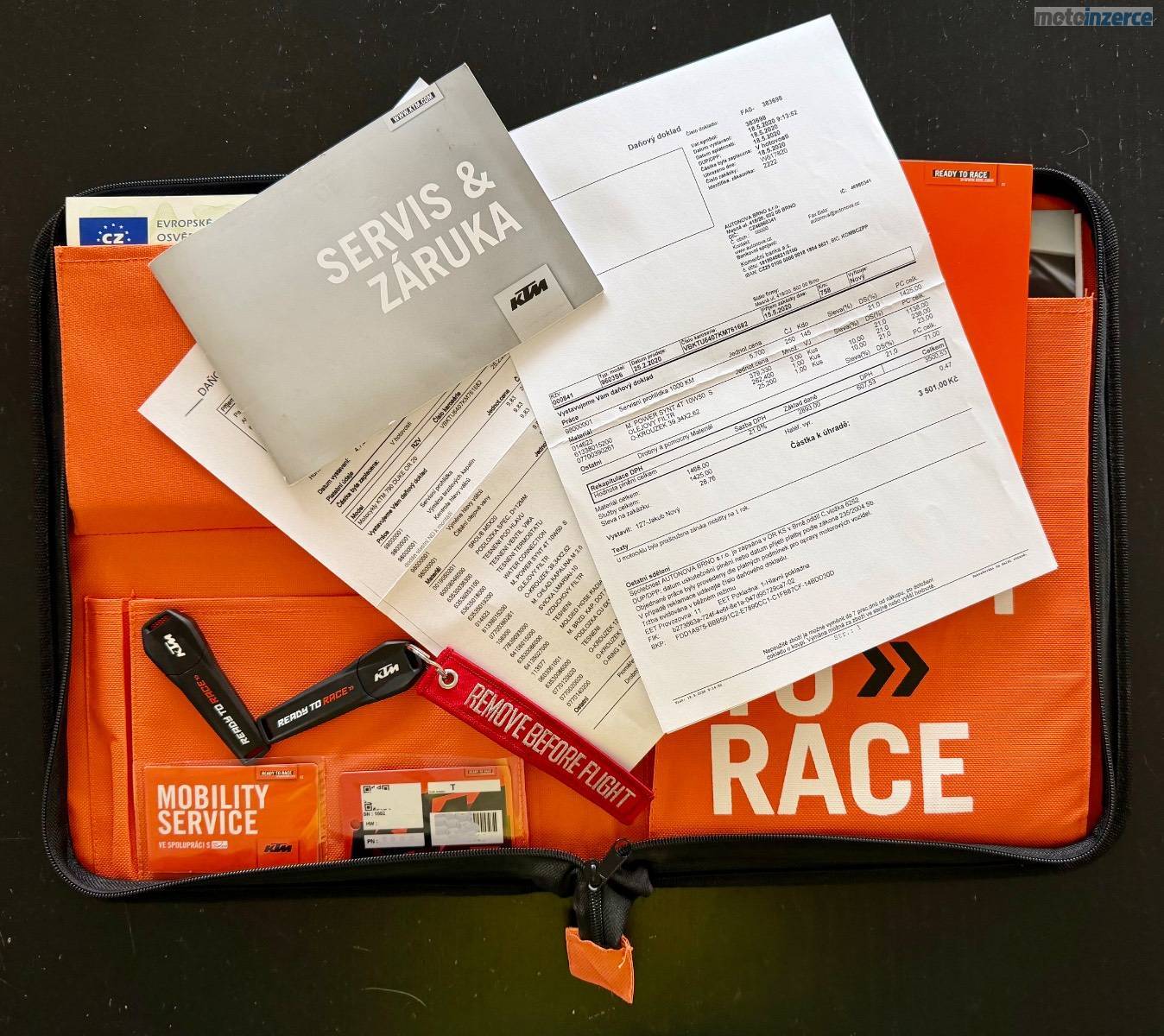 Součástí jsou i desky s dokumentací, návodem, druhým klíčem a kartou na přidělání klíčů.