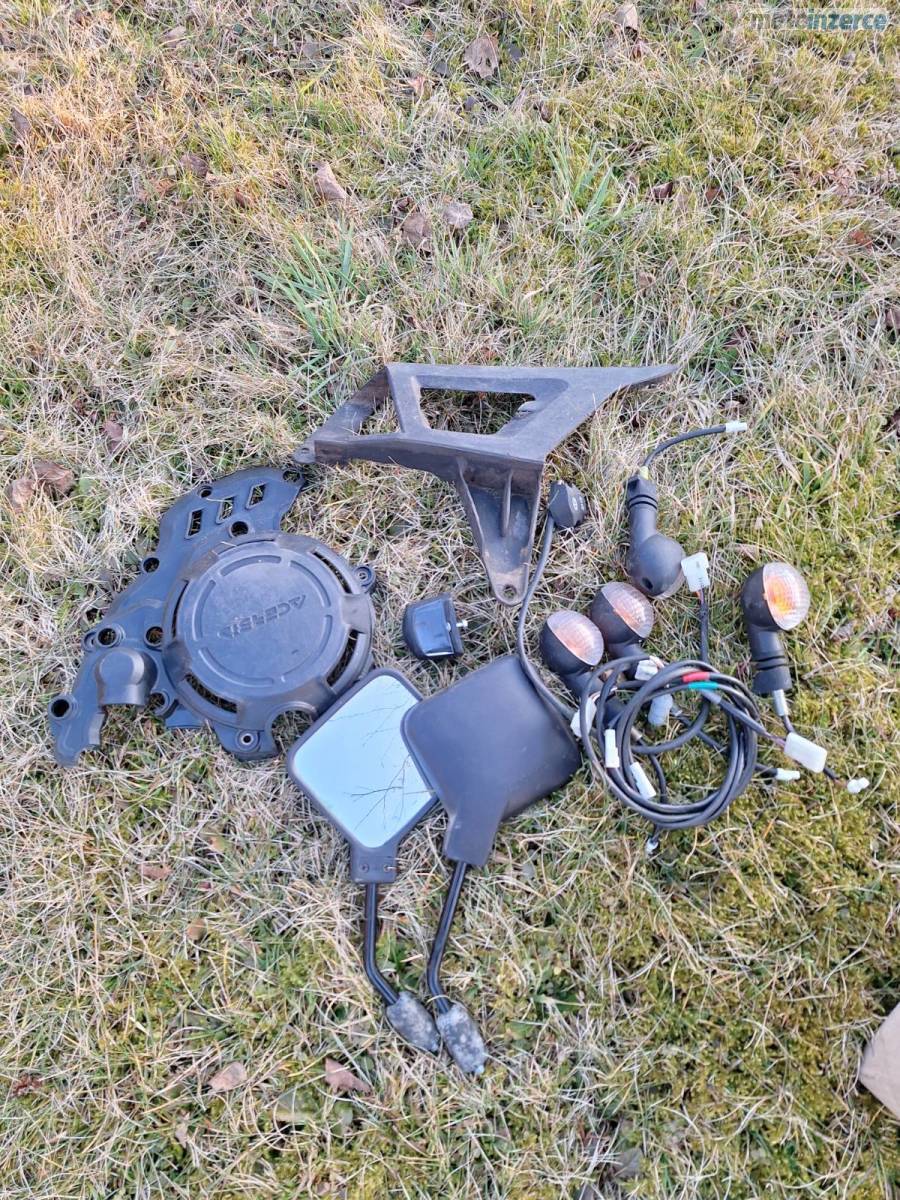 Na moto větší nádrž 12l, nerezové stupačky, větrák, kryt pod motor, kryty páček, kryty vík motoru.