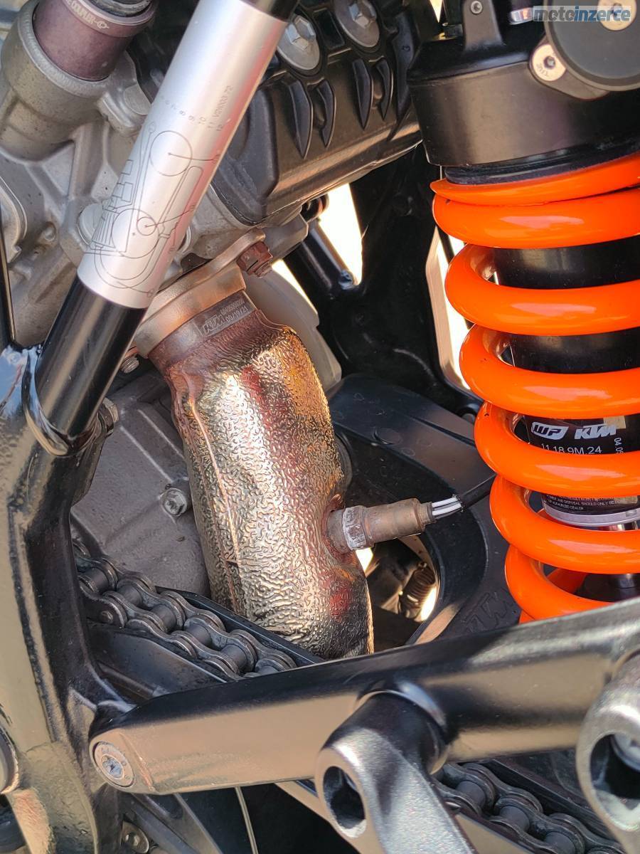 Odstíněný výfukový svod (KTM powerparts) přispívá životnosti zadního tlumiče