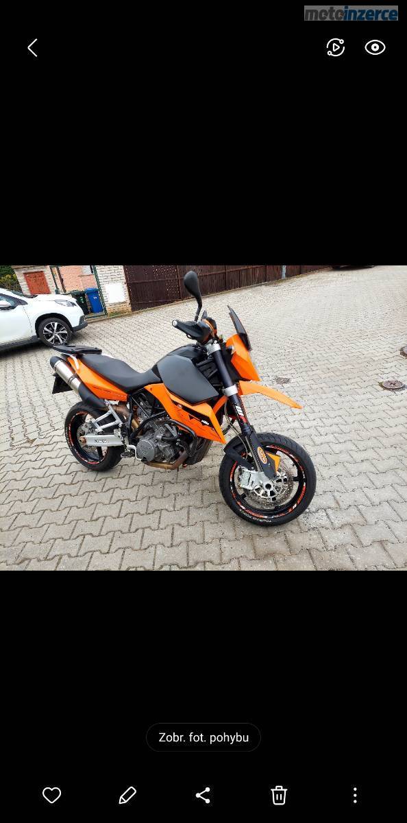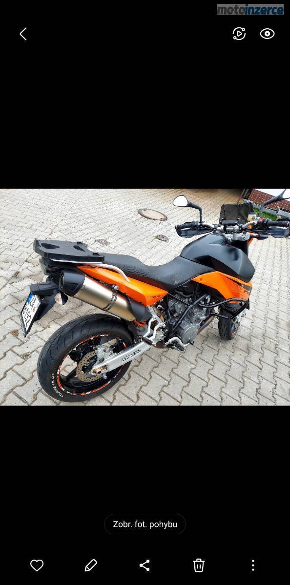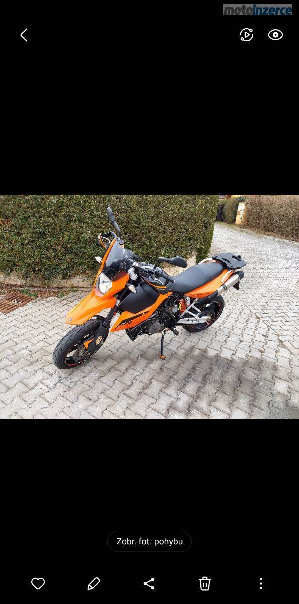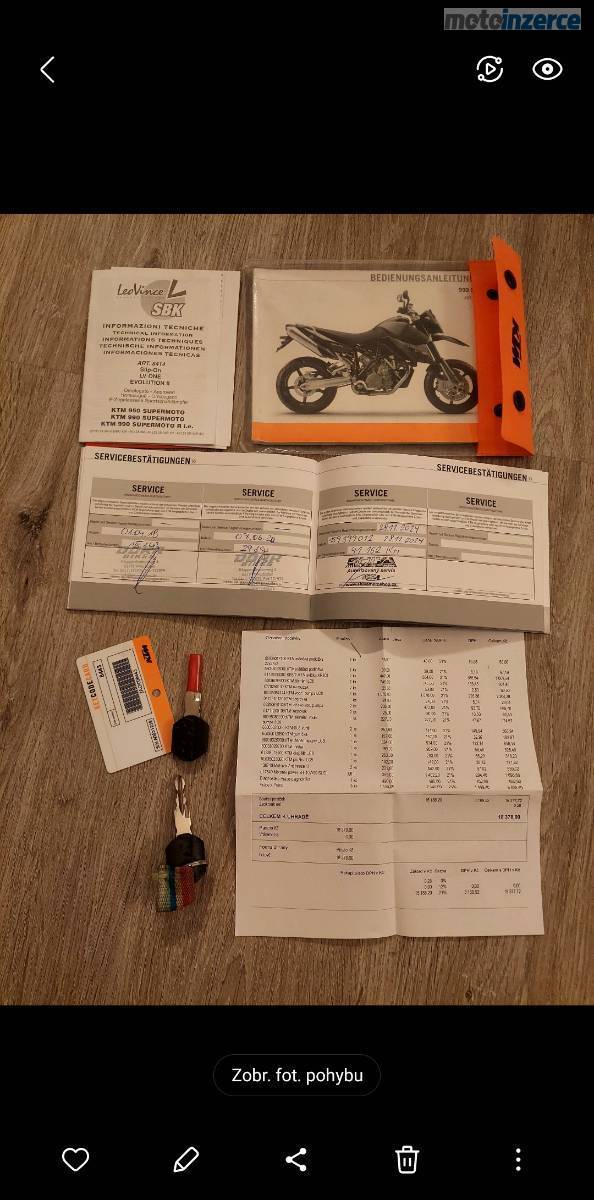 Prodam Ktm 990 sm supermoto r.v. 15.05.2008 najeto 42600 km velmi zachovala opečovávaná o motu: v 41162 u Shiva moto Ktm olej, ventily, nemrzka, vodni pumpa, svicky, diagnostika, predni + zadni desticky servis za 20000k retezovka najeto 3000 km, prevence vymena benzinove pumpy, gumicky v spojkove pumpicce u packy, olej menen kazdy rok, vyfuky Leo Vince homologovane, STK do 2.5.2029, k motu kufr, 2x plotna, 1x sedacka na zmenu posazu, oryg vyfuky k motu serviska navod k obsluze 2x klic vloni nova baterka nevyuzity stroj stoji neni cas