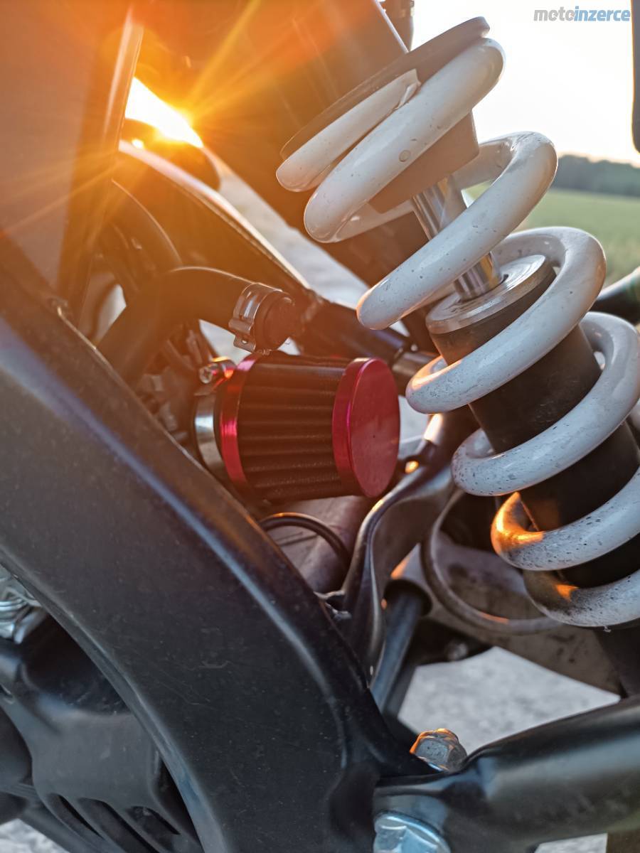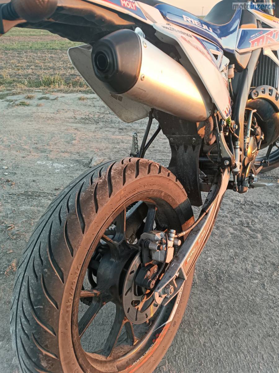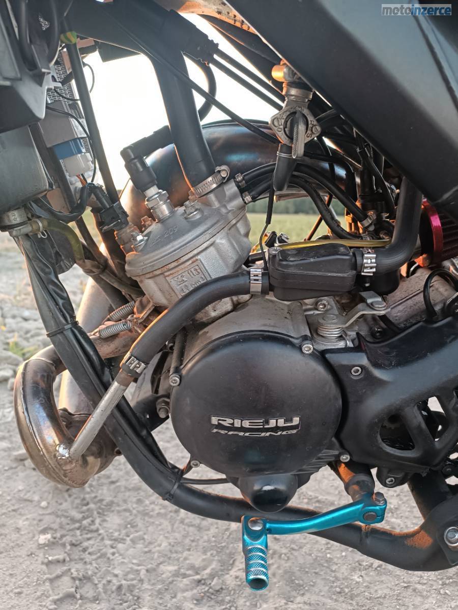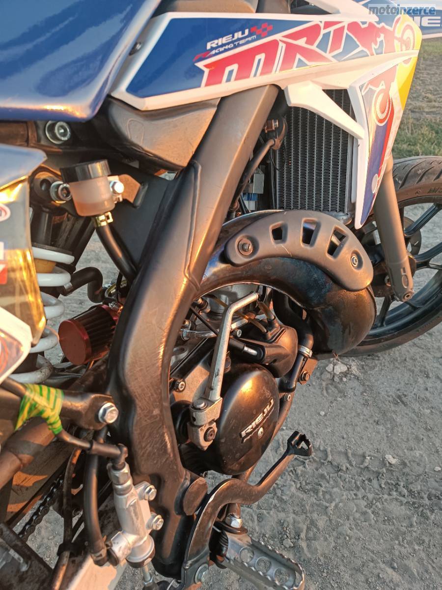 Zdravím, syn prodává španělskou Rieju mrt 50cc. Má najeto lehce přes 17tis. km, motor běží bez problémů a po vizuální stránce je motorka jako nová. Byly na ni dělané úpravy ( závodní vzduchový filtr, vyndané restriktory a odebrané elektronické omezování rychlosti, přetryskovaný karburátor.) Cestovní rychlost 75 80 km/hod. Otevřena až ve 12tis kilometrech, do té doby klasika = motor je ok.
