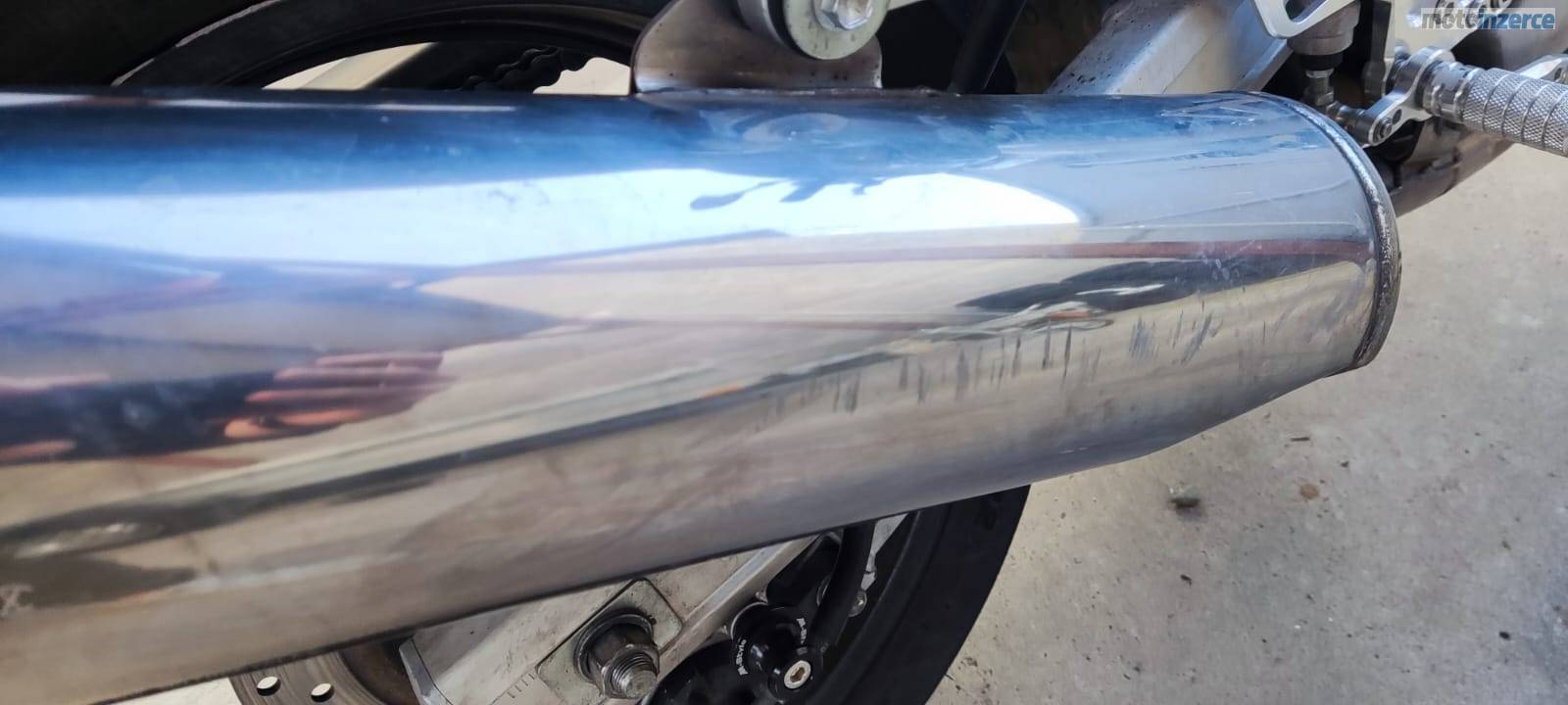 kosmetické vady – odřený výfuk a místy praskající barva na plastových částech (viz foto).