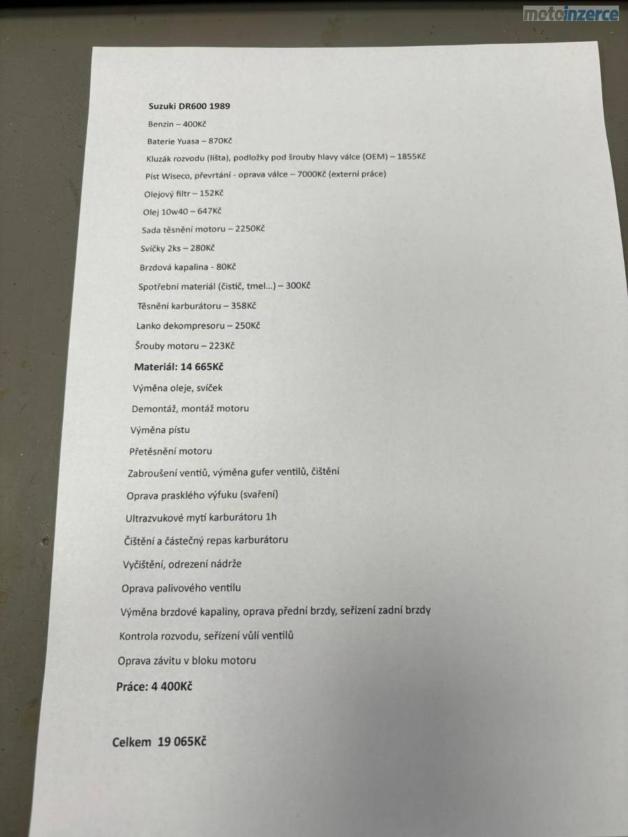 Prodám Suzuki DR 600 Djebel, r.v. 1988, najeto 70 000+ km, s TP, zachovalý stav, aktuálně po servise soupis viz foto, po servisu najeto zatím cca 25 km.