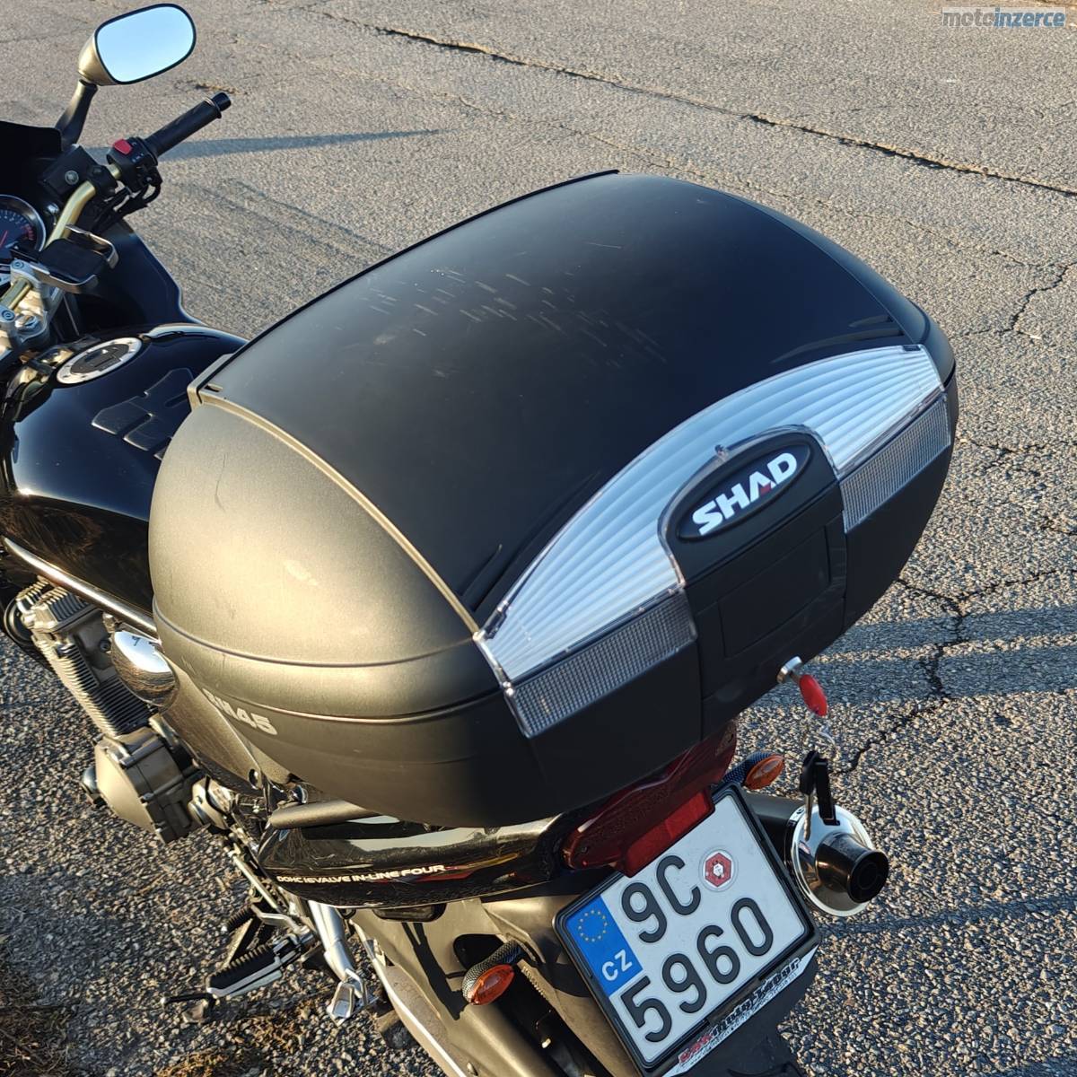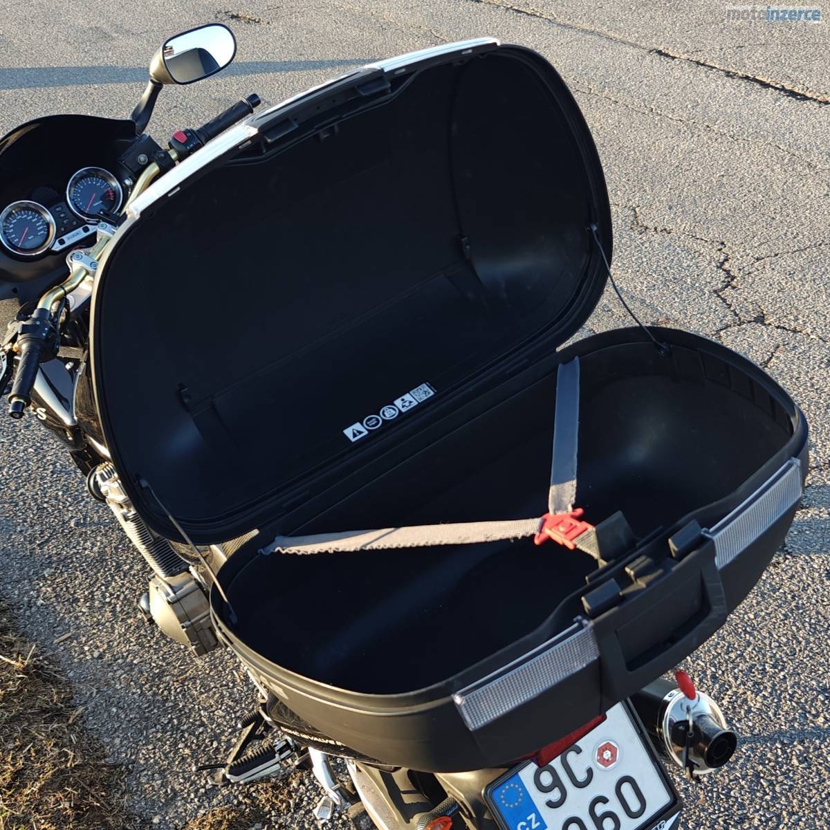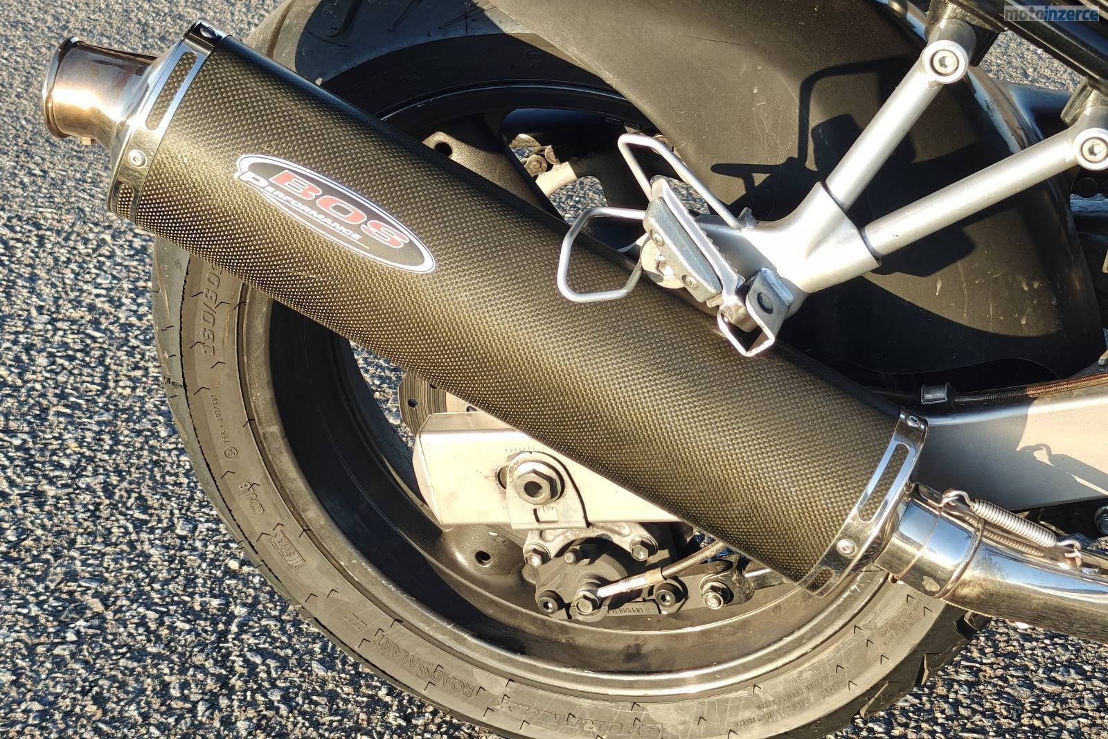 Nové pneumatiky (obuty 07/2025, najeto ani ne 1000 km). Laděný výfuk BOS Performance – skvělý zvuk. Custom M-Style páčky. Navíc kufr Shad SH45, který pohodlně pojme i dvě helmy.