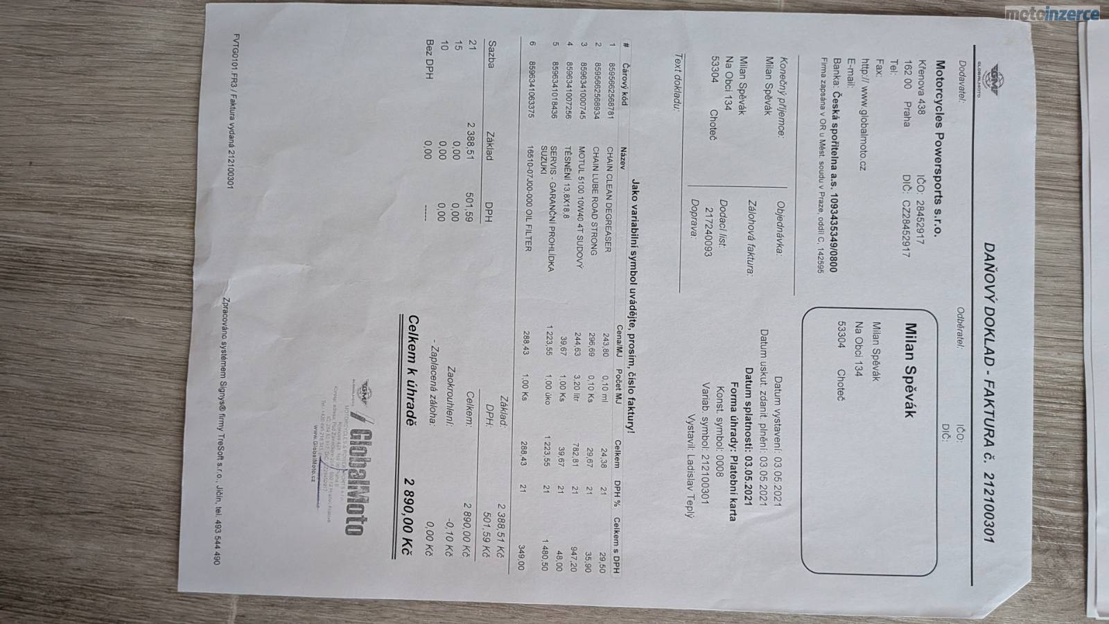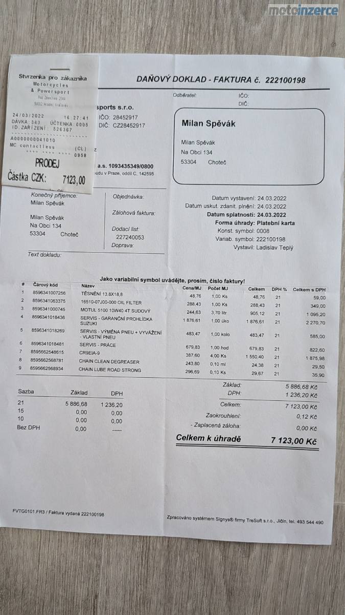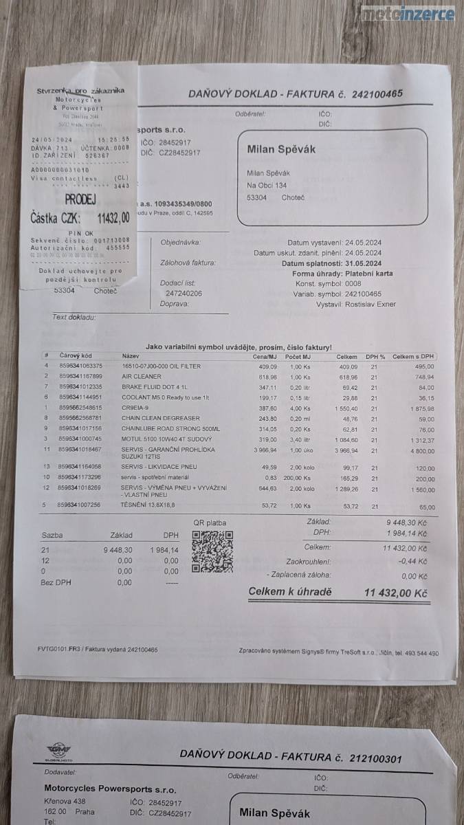 ✅ 05/2024 (12 145 km): VELKÝ SERVISNÍ INTERVAL (v hodnotě 11 500 Kč) – nové náplně (brzdovka, chladivo, olej Motul), všechny filtry, kontrola stroje.