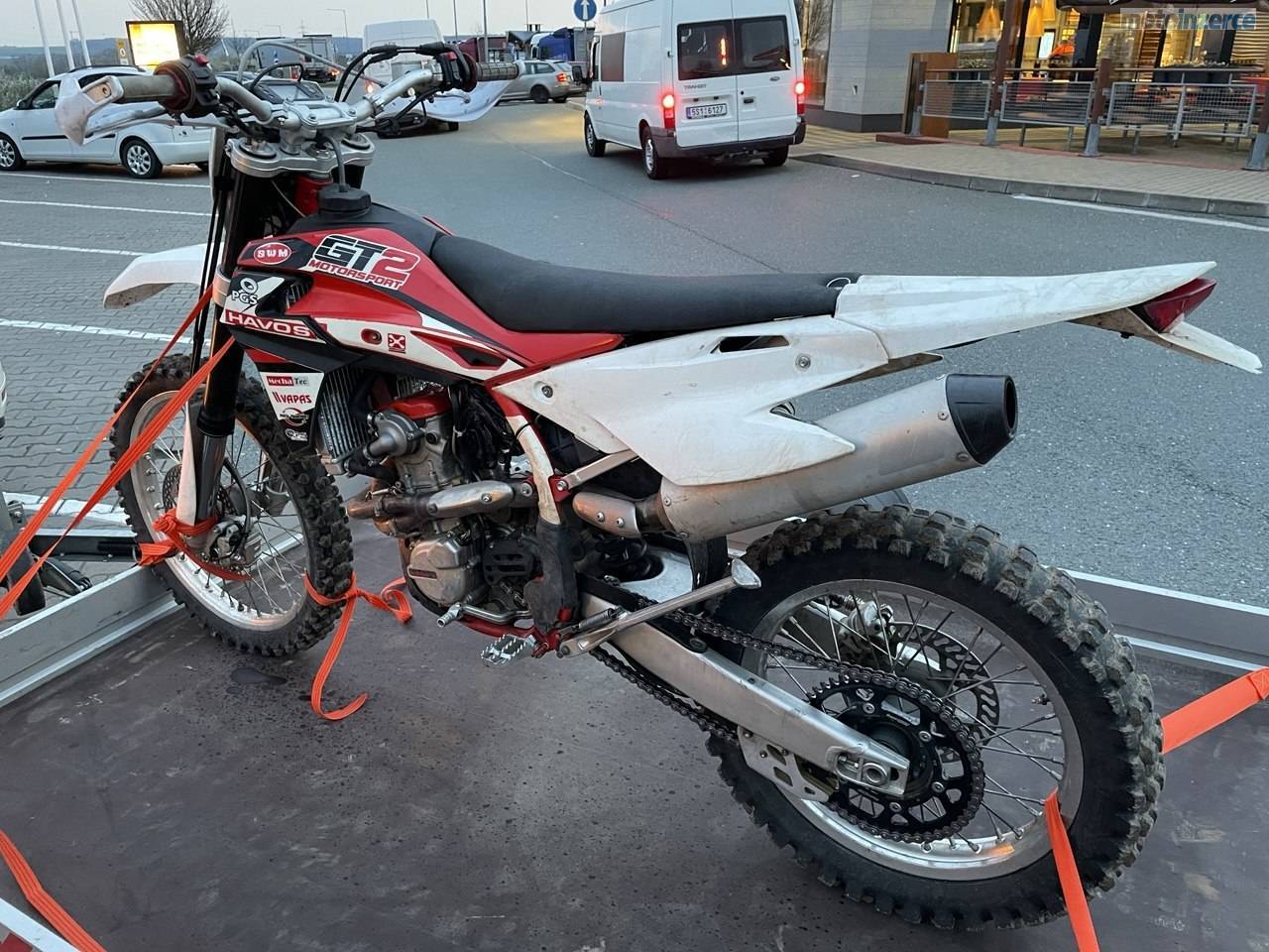 Jedná se o motocykl SWM RS 300 R, na fotkách je uvedená verze tak, jak jsem ji koupil a poté verze, kde je určitá část plastů nová a zároveň polepená do zeleno/karbonové.
