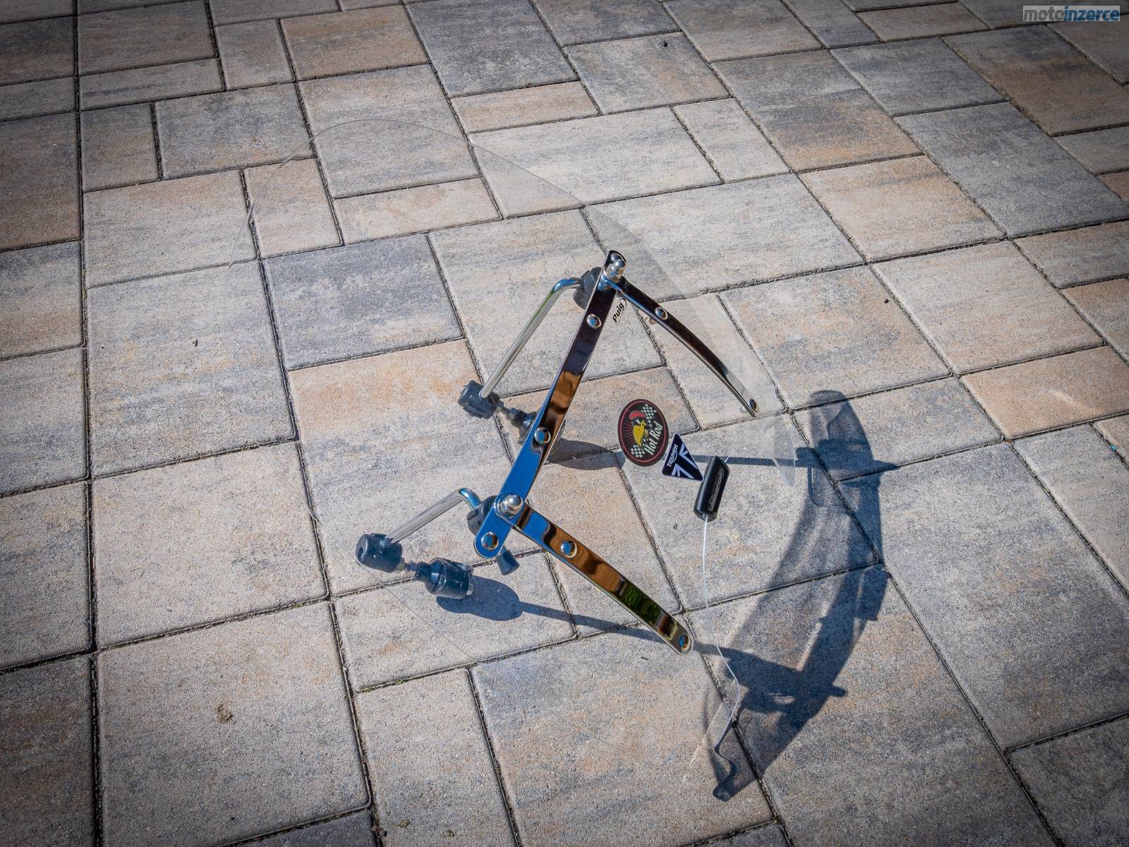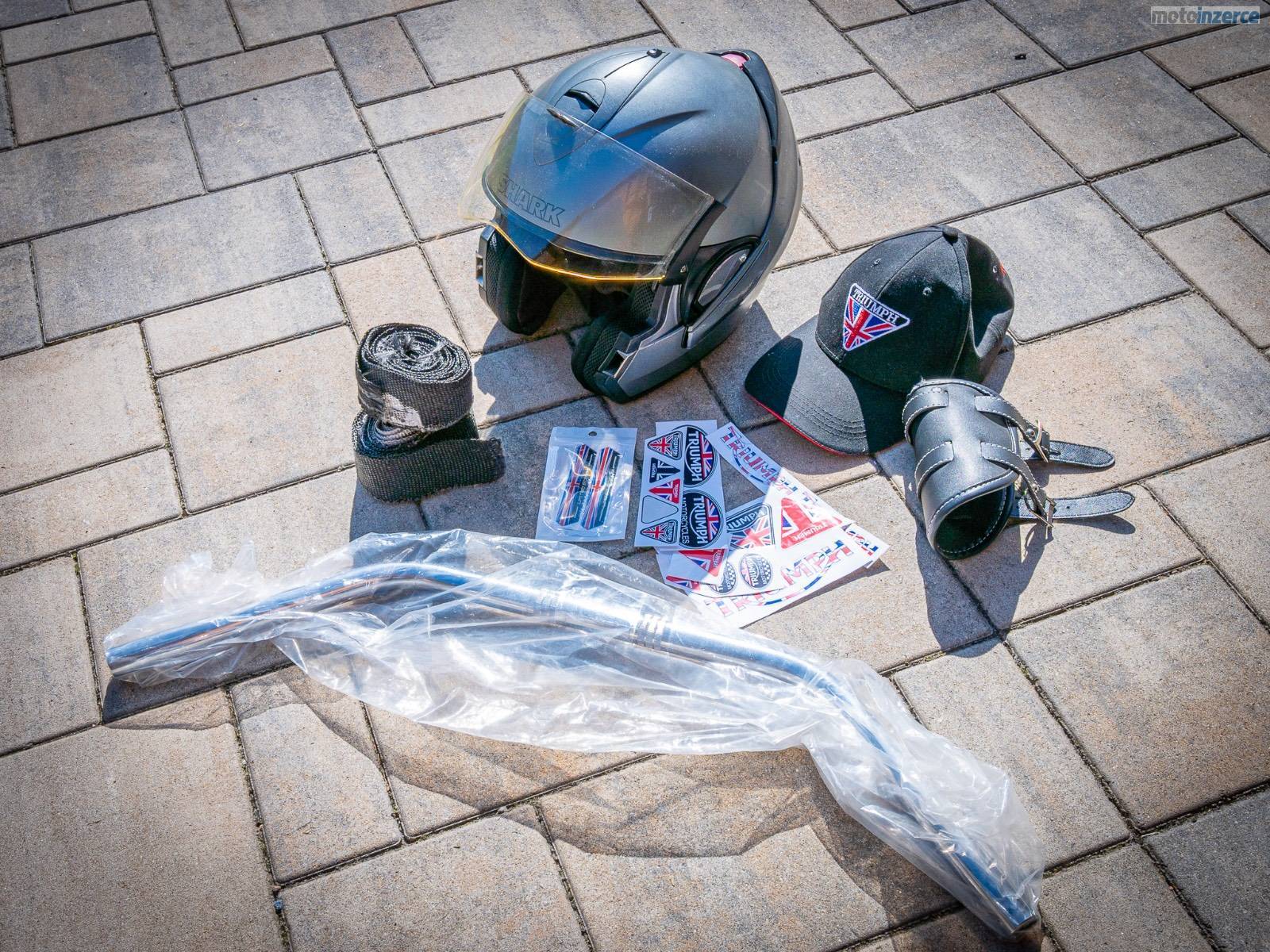 Omotávky výfuků, originální kšiltovka Triumph, samolepky, a překlápěcí helma Shark Evo (L) – plně funkční, ideální jako rezerva.