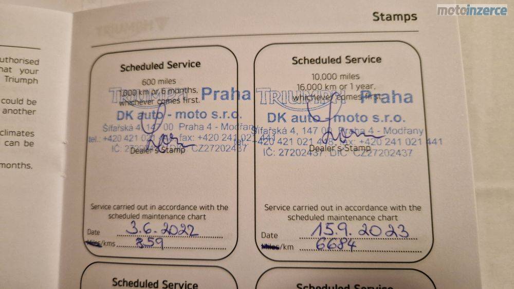 - zakoupen v Triumph Praha jako první majitel, servisován pouze u prodejce, servisní kníha k dispozici