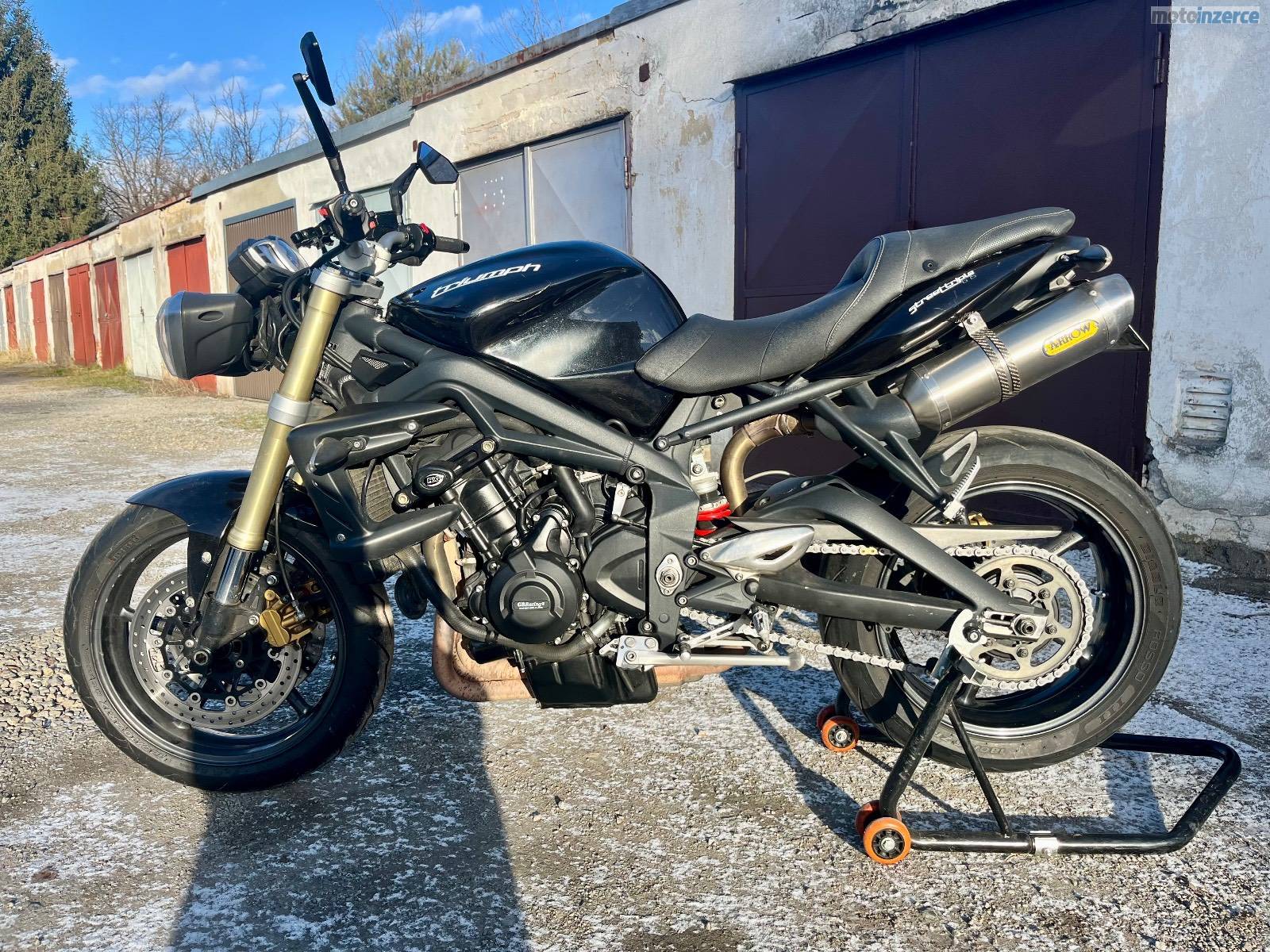 Doplňky: originál laděné výfuky od Triumphu Arrow s vyndavacím DB killerem a homologací, kryty motoru GB Racing, padáky motoru a krátký držák SPZ RaG racing + originál, stavitelné páčky Mstyle + originál, 2x zrcátka Mstyle (klasické na motorce + boční Caffé racer, Domino gripy, těžší závaží v řidítkách + originál, upravené sedlo