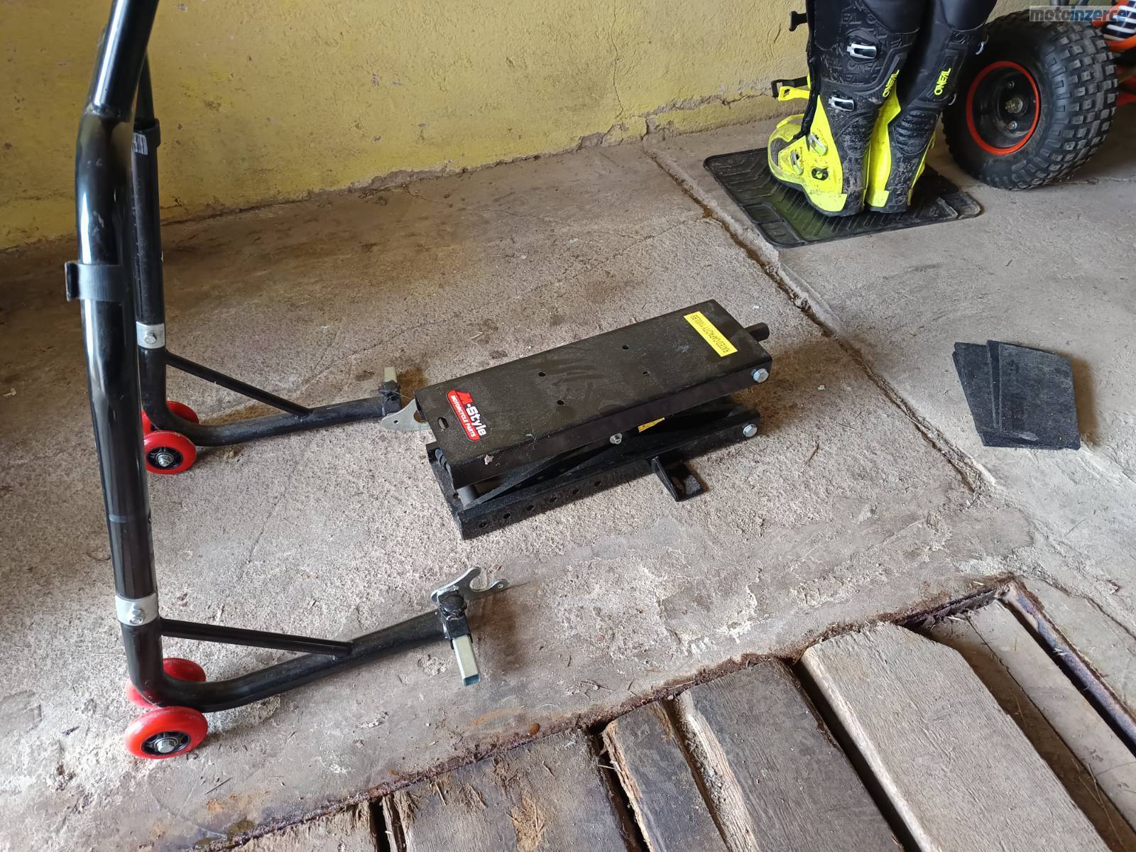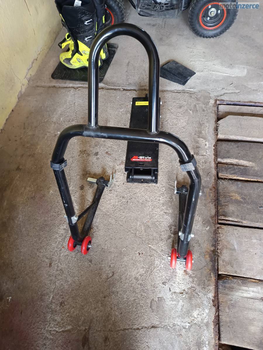 Součástí inzerátu je i stojan do zadního kola a nůžkový zvedák na fotografiích.