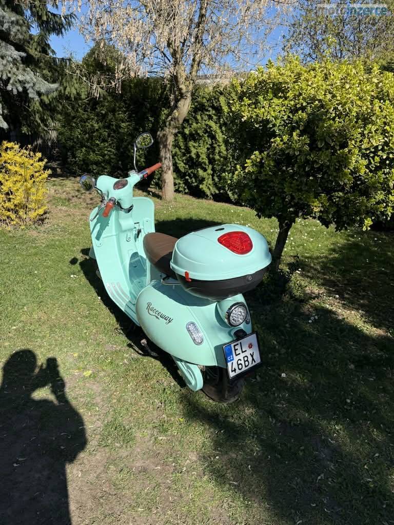 Elektrický skútr Racceway Century spadá do kategorie malých motorek a vyžaduje tak ke svému řízení řidičský průkaz AM. O vysoký výkon a maximální rychlost 45 km/h se stará tichý elektrický motor s příkonem 2000 W, který má nulovou produkci zplodin. Elektrický skútr se pyšní skvělými jízdními vlastnostmi, které zajišťuje kyvná vidlice společně s kvalitními 11" koly a odpružením. Racceway Century je navíc vybaven hydraulickými kotoučovými brzdami a automatickým denním svícením z LED diod. Nechybí ani funkce uzamykání řídítek s alarmem na dálkové ovládání a možnost bezklíčového startu.