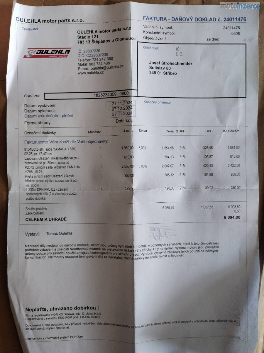 Prodám Yamaha yz 85 r.v. 2023, najeto 134 mth. Motorka je v pěkném a udržovaném stavu. Ve 109 mth dělané GO motoru, vyměněny všechny ložiska, gufera, ojnice, píst a td. Vše doložím fakturaci a foto. Tel. 721 713 752