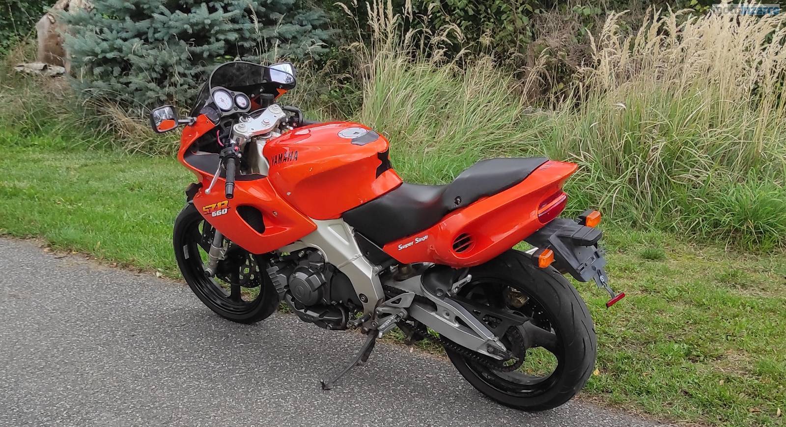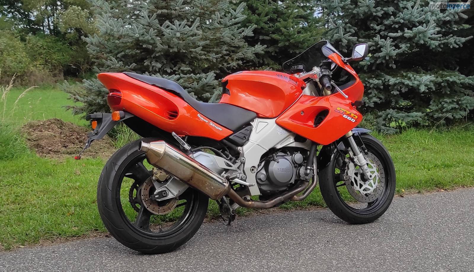 Yamaha SZR 660 r.v. 1996, najeto doložených 42tis. km, výkon 35 kW, tedy i pro řidičský průkaz skupiny A2, motorka vhodná pro holky, je malá, lehká, s nízkým sedlem a krásně ovladatelná, kapotovaná varianta k Suzuki GS 500 a Kawasaki ER-5, stav dobrý, lak původní, nebouraná, oděrky se samozřejmě najdou, dvousměsové pneu Michelin Pilot RS s 50% vzorkem, řetězová sada také minimálně 50%, 2 originální klíče, uživatelský manuál, snadné přihlášení kompletní německé doklady s platnou německou technickou prohlídkou, stačí tedy jen evidenční kontrola a přihlásit, cena 35tis. Kč
