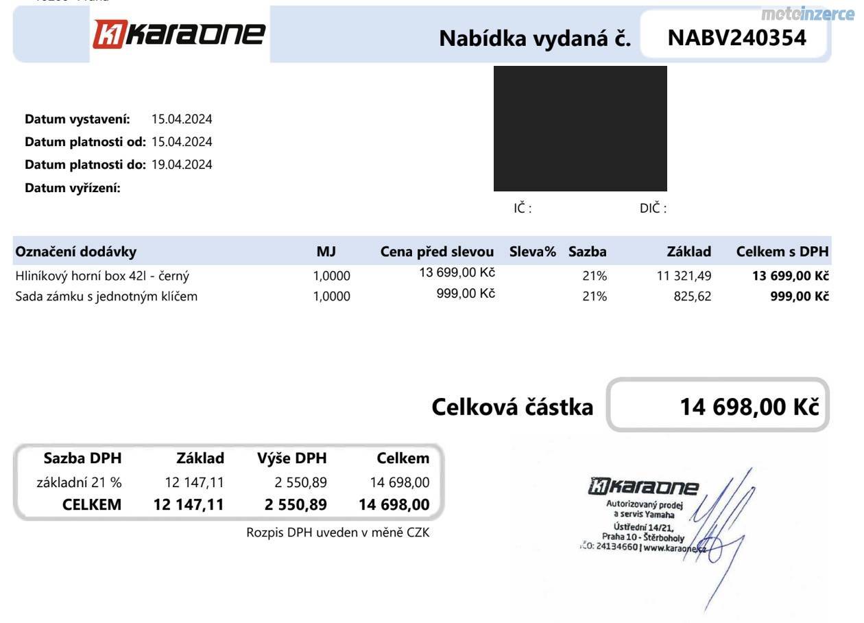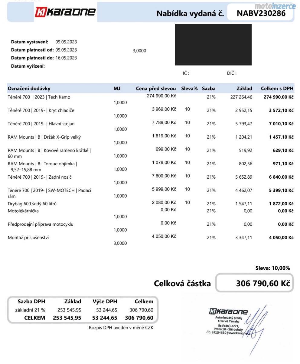 Původní pořizovací cena motocyklu byla cca 320 000 Kč, k tomu bylo dokoupeno velké množství kvalitního příslušenství