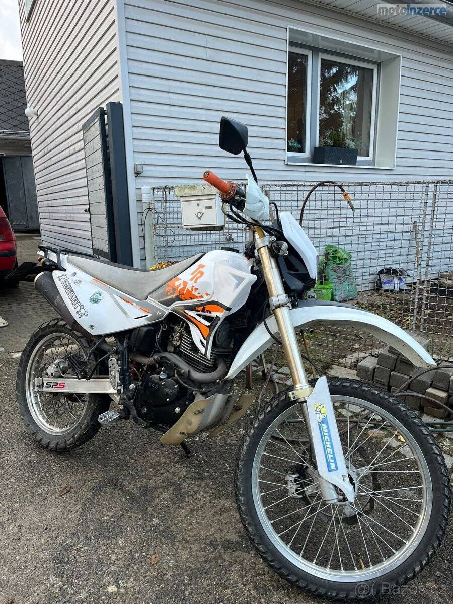 Prodám svůj čtyřtakt. Na papírech psaná jako 125 dvaca, ale má větší motor (orgiginál SUZUKI DR 200). Možné řídit s A1. Spolehlivá, silná a pohodlná. Koupena byla před 5-ti lety. Nová technická až do října 2029. Stav plně funkční, nic nekape ani neteče, občas nějaký ten škrábanec, pravidelně měněný olej, filtry. Neduhy jsou zadní pneu už na výměnu, taktéž řetěz, zlobí otáčkoměr. Sloužila bez problémů a nikdy nechyběla síla.